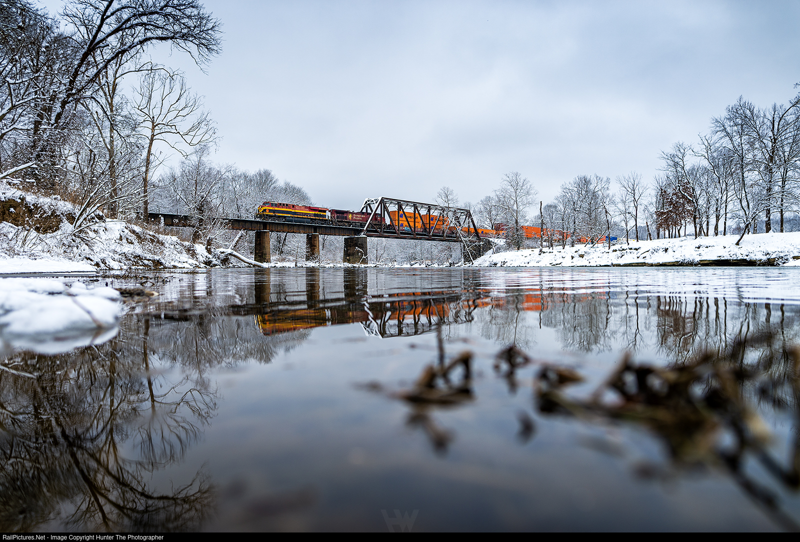 Vibrant Snow Day | The reds and yellows of northbound CPKC intermodal train I181 reflect in the Illinois River near Watts, OK on the afternoon of Friday, January 10, 2025. Following Winter Storm Cora, several inches of snow lay on the ground in eastern Oklahoma.