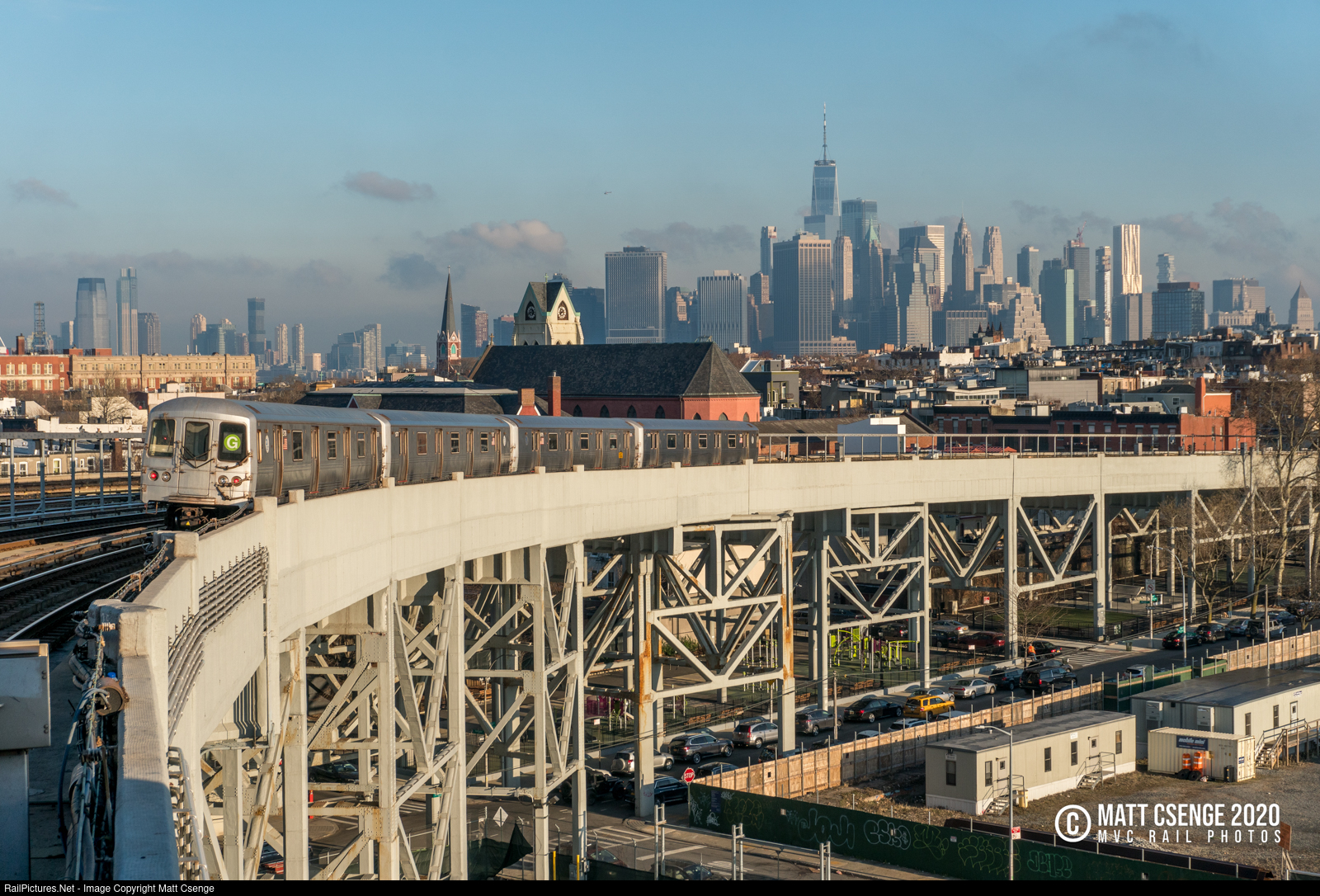 Not Going There. A Queens-bound New York City Transit Authority (NYCTA) G train curves out of Smith-9th Streets Station on the IND Culver Line, with the lower Manhattan skyline looming in the background. The G is the only subway service (as always, aside from the shuttles) that does not run into Manhattan, but rather takes the Crosstown Line directly from Brooklyn to Queens. Pullman-Standard R46 car 5776 brings up the rear of the 4-car train, which is half the length of a standard NYC Subway train on most other services.