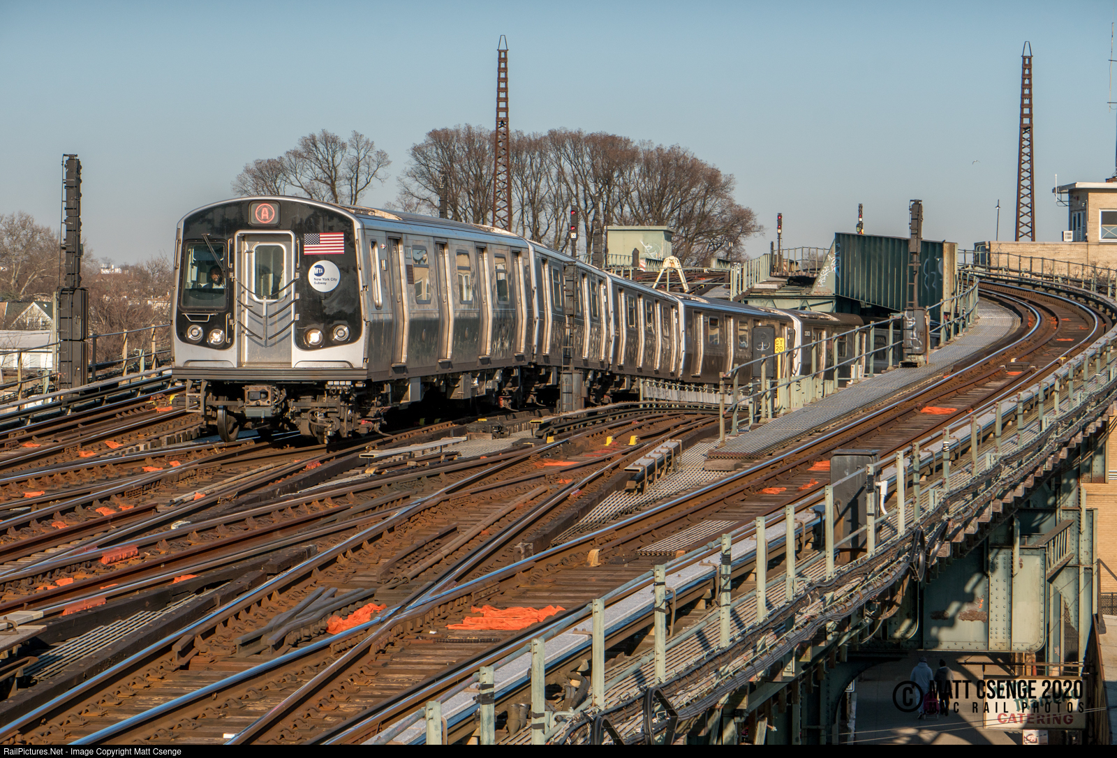New York City Transit Authority (NYCTA) car 3307 is the lead motor on a Brooklyn-bound A train seen rising up onto the IND Liberty Avenue Line from the connection to the IND Rockaway Line. The train, which will shortly make its station stop at Rockaway Boulevard Station, is made up of then-new R179 cars manufactured by Bombardier from 2016-2019. |