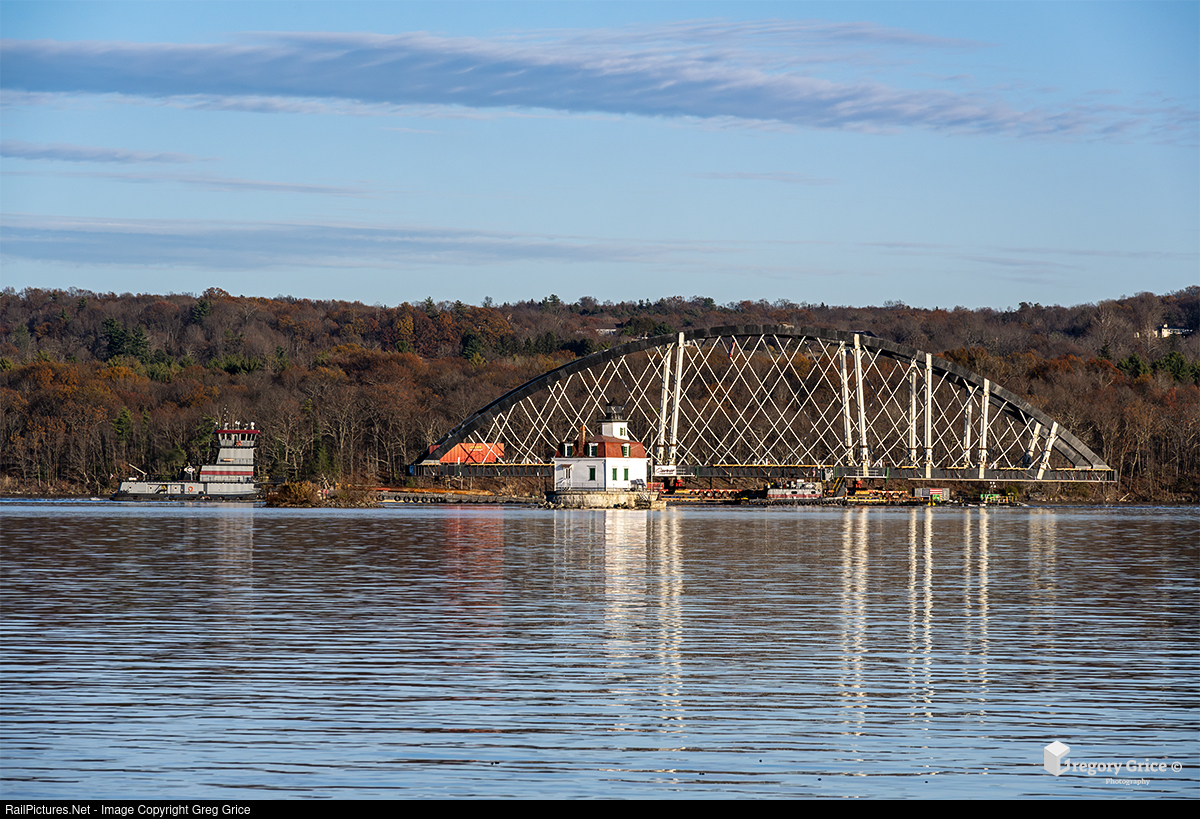 On November 19th, 2024, the first of three Portal North Bridge arches/spans dwarfs the Esopus Meadows Lighthouse as it floats down the Hudson River in Port Ewen, New York. .