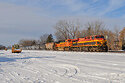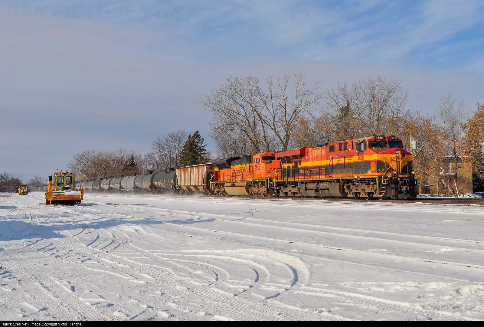 CPKC's as needed ethanol train 528 is passing the Dorion Yard, which is now used for MOW equipment storage. KCSM 4659 is leading, with a BNSF SD70Ace trailing.