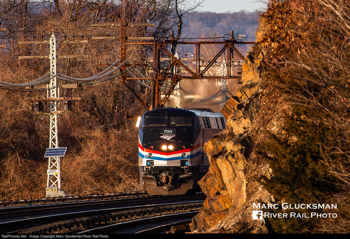 Retro Perspective. Under a beautiful winter sun, weekend only Amtrak Train 256 pops out from behind the rough rock near the station in Scarborough, New York on Sunday, January 13, 2019 with AMTK 700 (P32AC-DM) leading. Still fresh in its vintage retro Phase III re-paint, under a former New York Central signal bridge and next to the signature power gantries that Joshua Lionel Cowen was as well known for as the actual railroad, one can easily imagine this scene with a different locomotive in decades prior.