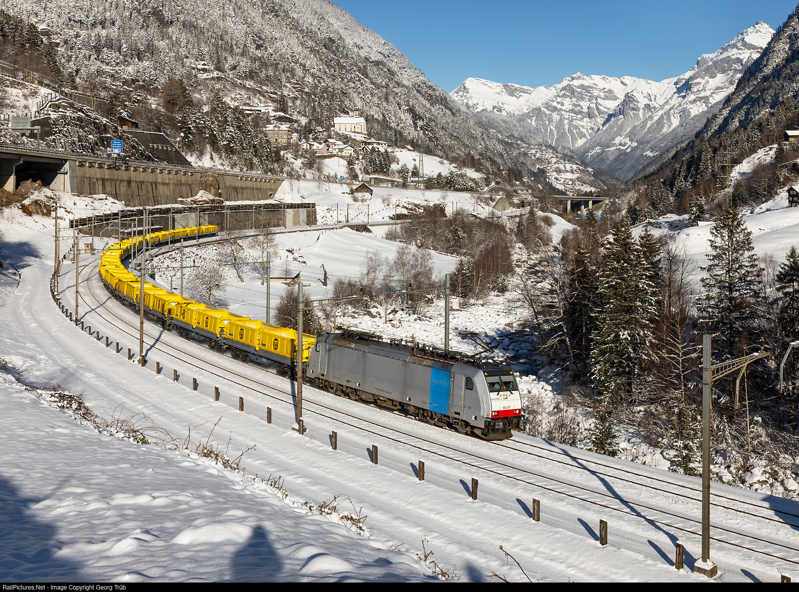 | Bombardier TRAXX F140 MS 186 # 497 of Railpool, rented by TR TransRail, pulls the empty excavation train 67673 from Flüelen to Airolo, through the Wattinger curve between Gurtnellen and Wassen on the Gotthard north ramp. Excavated material from the construction of the second Gotthard road tunnel is transported from Airolo to Flüelen and deposited in Lake Uri (part of Vierwaldstättersee) |
