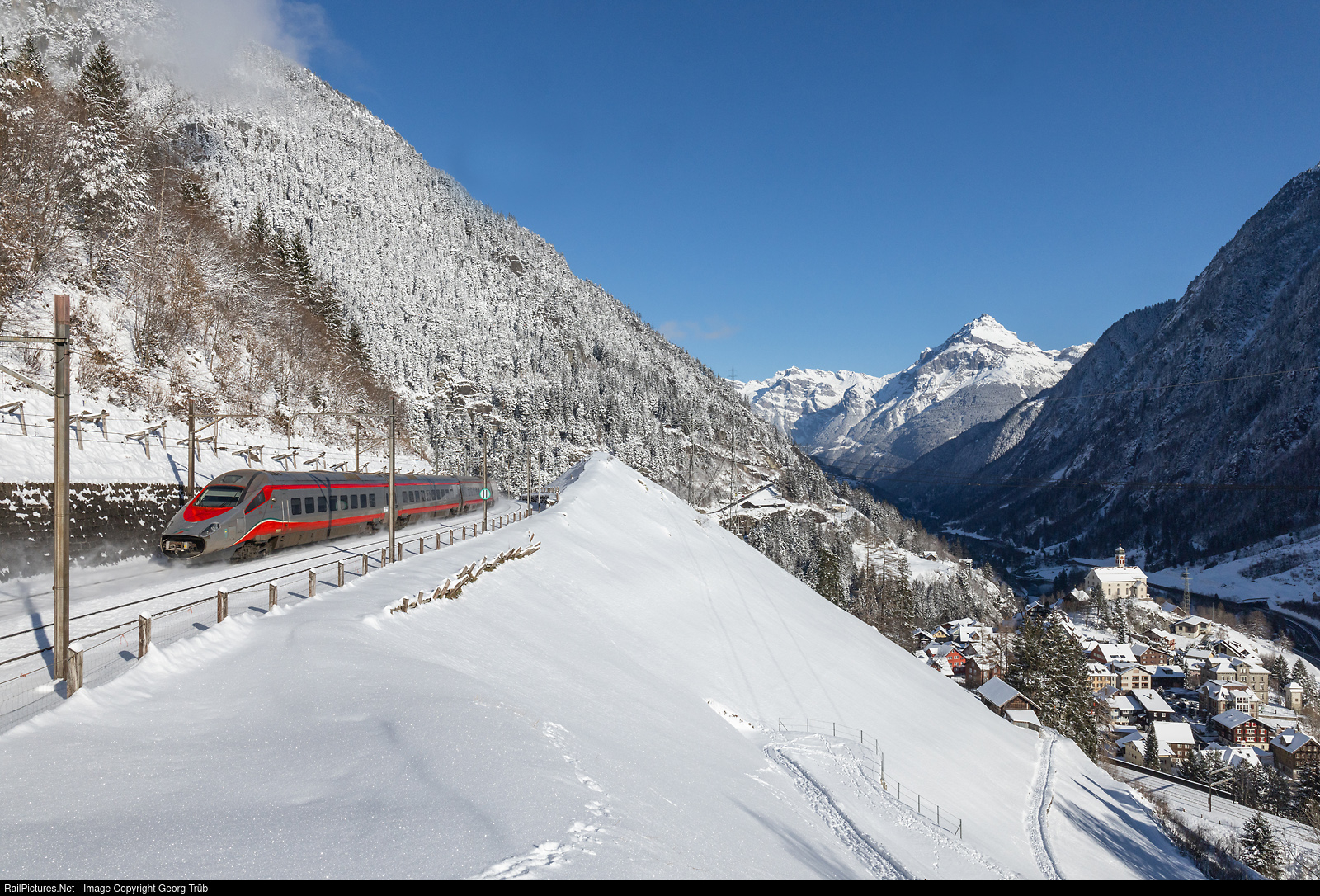 | Due to construction work in the Gotthard Base Tunnel, passenger trains will be rerouted via the Gotthard mountain route from January 13 to 25, 2025 and the base tunnel will be available for freight traffic without restriction. Highspeed tilting train ETR 610 # 001 of Trenitalia is running the Eurocity 10014 from Milan to Zürich, on the uppermost level of the loops at Wassen. In the right lower corner of the picture you can see the middle level, where the train will pass in about 1 1/2 minute. |