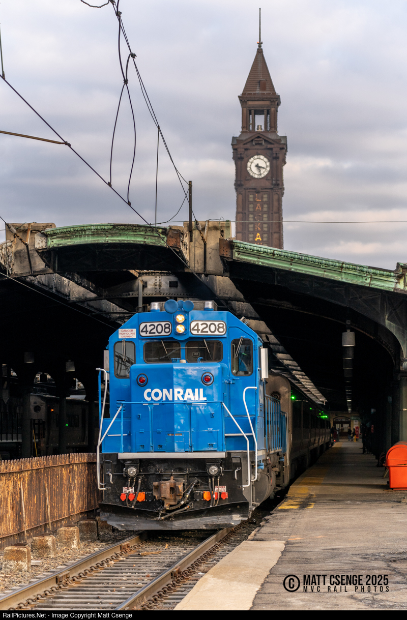 NJ Transit GP40PH-2B no. 4208 is seen departing Hoboken Terminal with Pascack Valley Line train 2117. The locomotive recently entered revenue service in its brilliant blue Conrail heritage livery. |