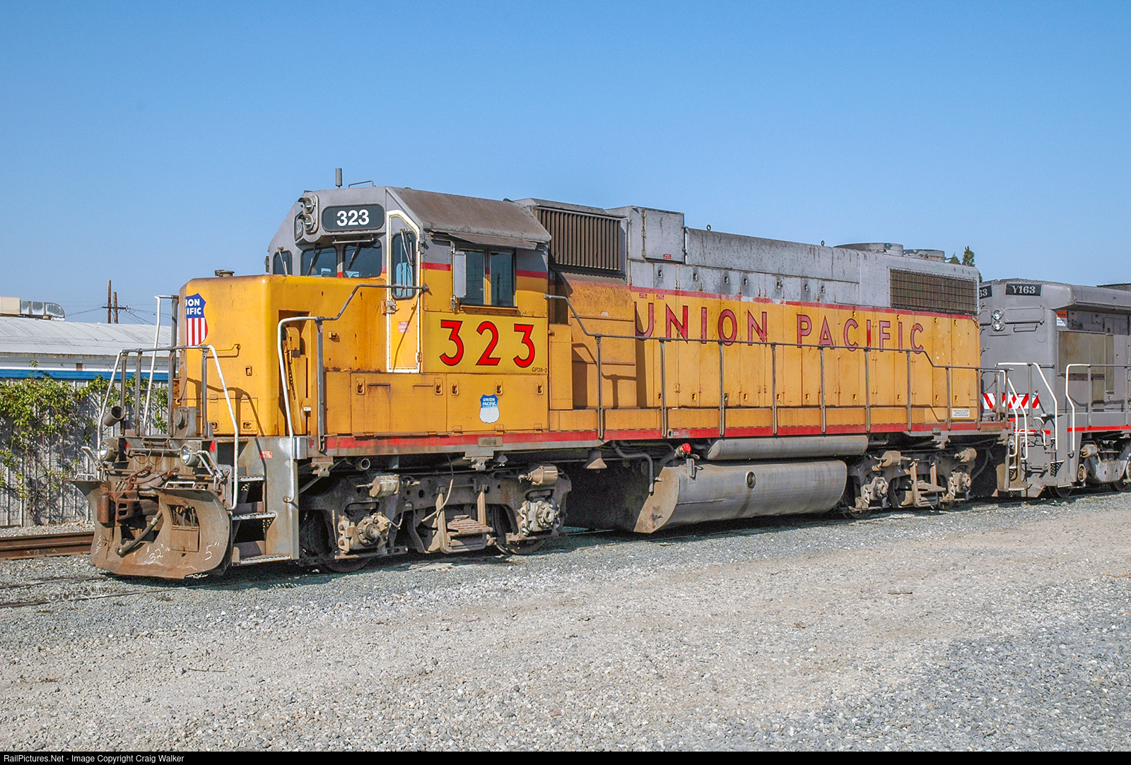 Union Pacific GP38-2 323 was built by General Motors Electro-Motive Division as Missouri Pacific 914 in October 1972. MoPac later renumbered it to MP 2065. It was eventually sold to Helm Financial Corporation, where it became HLCX 2065. Helm eventually sold it to Union Pacific (to whom it would have ended up if the MP hadn't unloaded it before the merger of the two railroads), becoming UP 1823. UP later renumbered this Geep to UP 323, as seen here. (Anaheim, California - July 8, 2005)