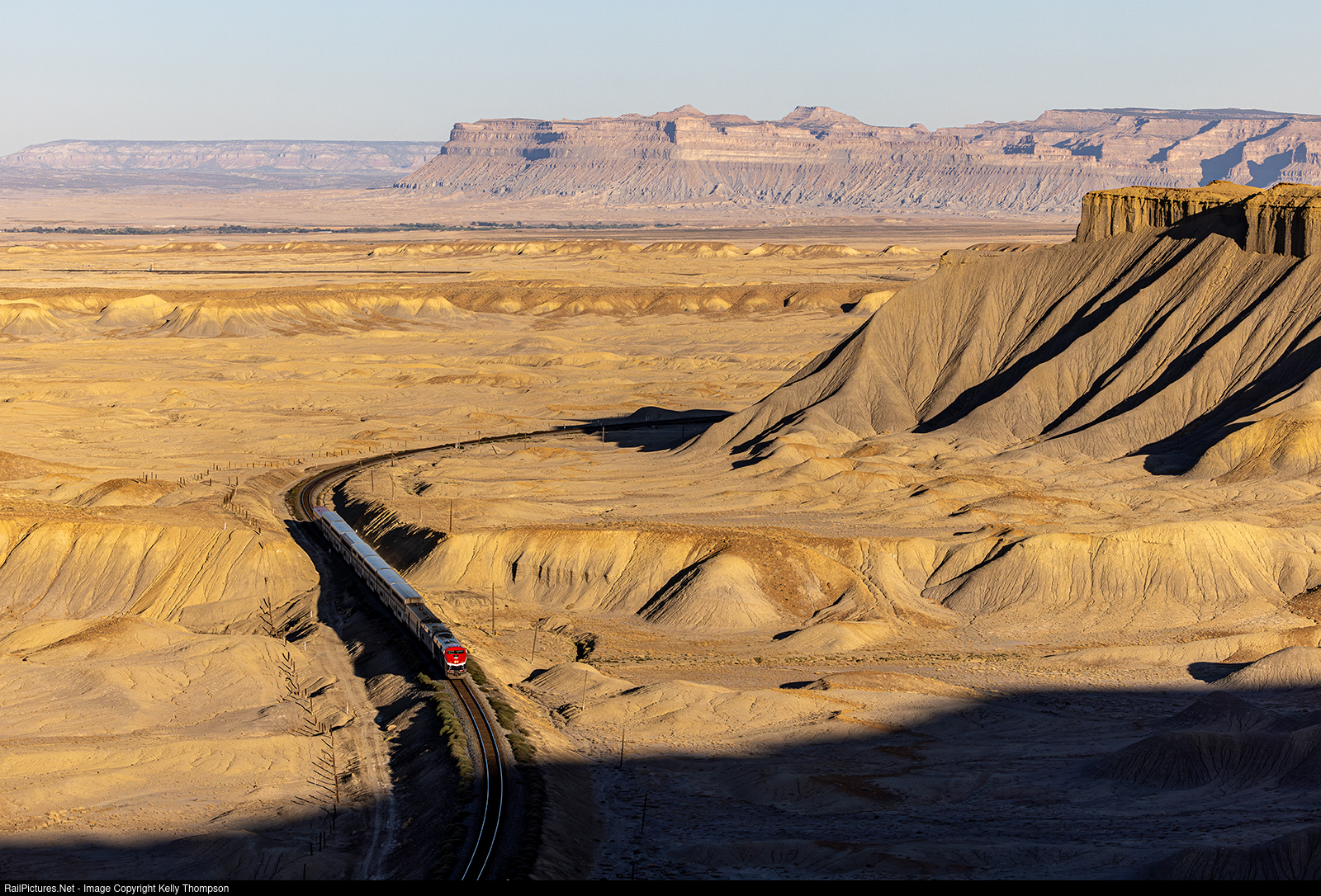 | Amtrak breaks the morning silence in the desert as new schemed AMTK 187 leads the eastbound Cali Zephyr past Floy. It's one heck of a climb to get up here but the view is great. This location, Patrick's Point, is named after Mel Patrick, an absolutely fantastic photographer that was really ahead of his time. |