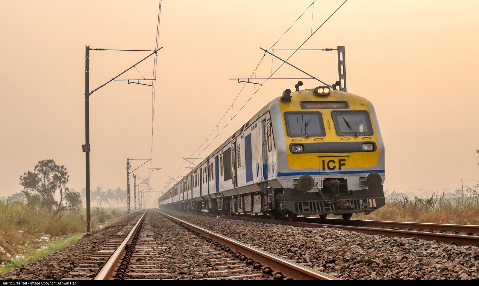 01524 Daund Pune DEMU proceeds towards Kadethan for next scheduled halt under a foggy winter morning light.