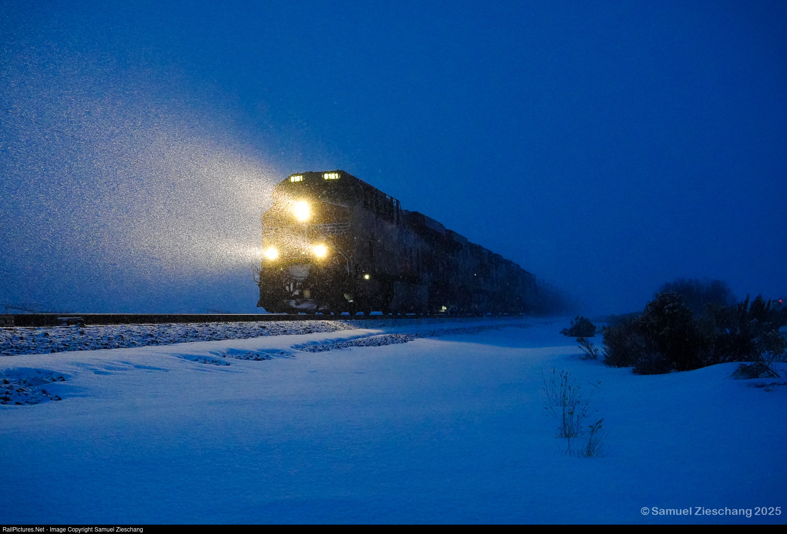 In blue hour and with snow falling, an empty crude oil train exits Byers Canyon on its journey west.