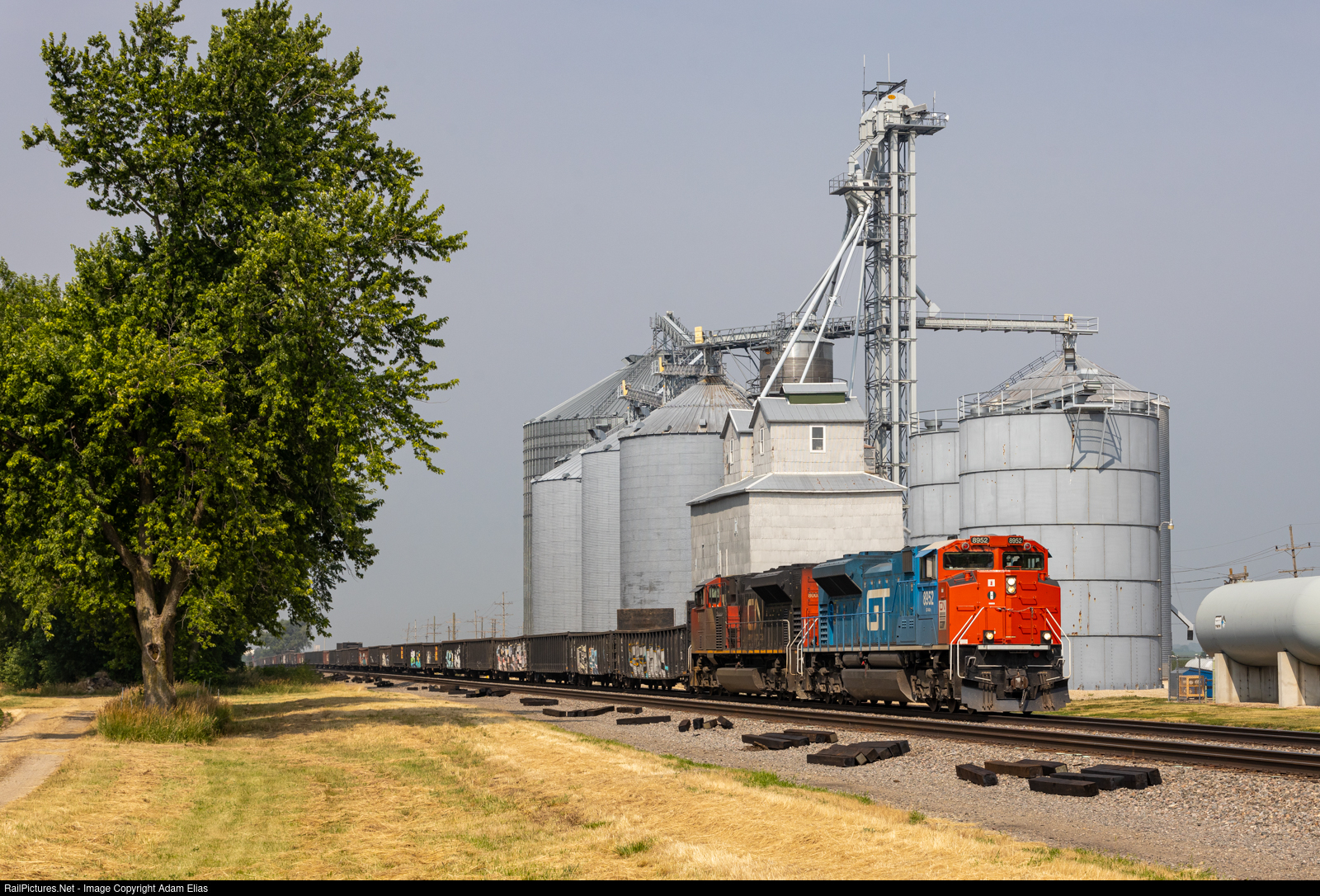 The GTW heritage unit leading a train of empty gondolas across the BN Mendota Sub for interchange to the CN at Eola.