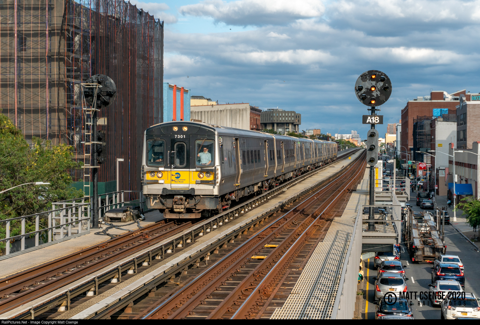 An inbound Long Island Rail Road (LIRR) train led by M7 car 7301 approaches Nostrand Avenue station, above the throngs of commuters heading to points East via Atlantic Ave. |