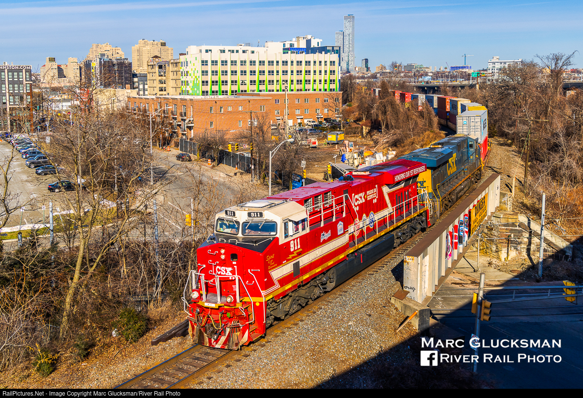 Never Forget. CSXT 911 "Spirit Of Our First Responders" (ES44AH) was leading CSX I010-14 over Johnston Avenue in Jersey City, New Jersey on January 15, 2022 under a bright winter sun. Written on the the back of the engine is “Never Forget….New York City/Washington, DC/Somerset County, PA” in memory of the attacks of September 11, 2001. This location is a little over 2 miles from the former World Trade Center site, the closest point on mainline freight trackage to that location.