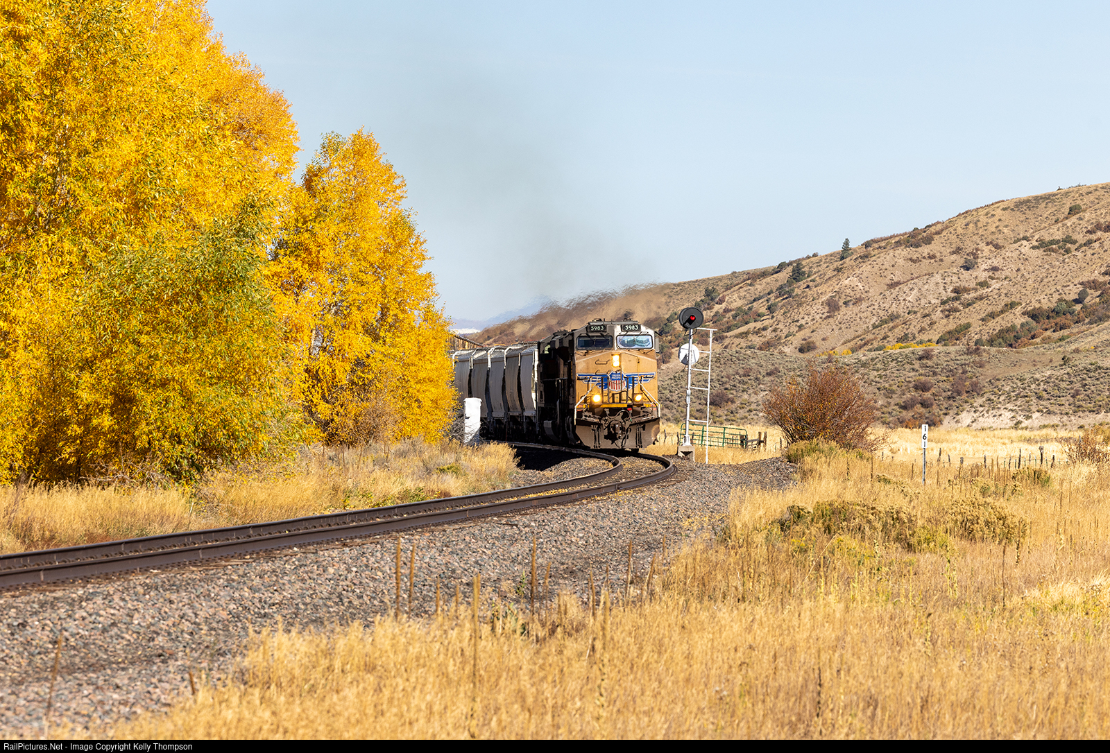 | The Bond local heads south through Yampa past an intermediate set of Rio Grande searchlights. Fall colors will still holding on surprisingly well. |