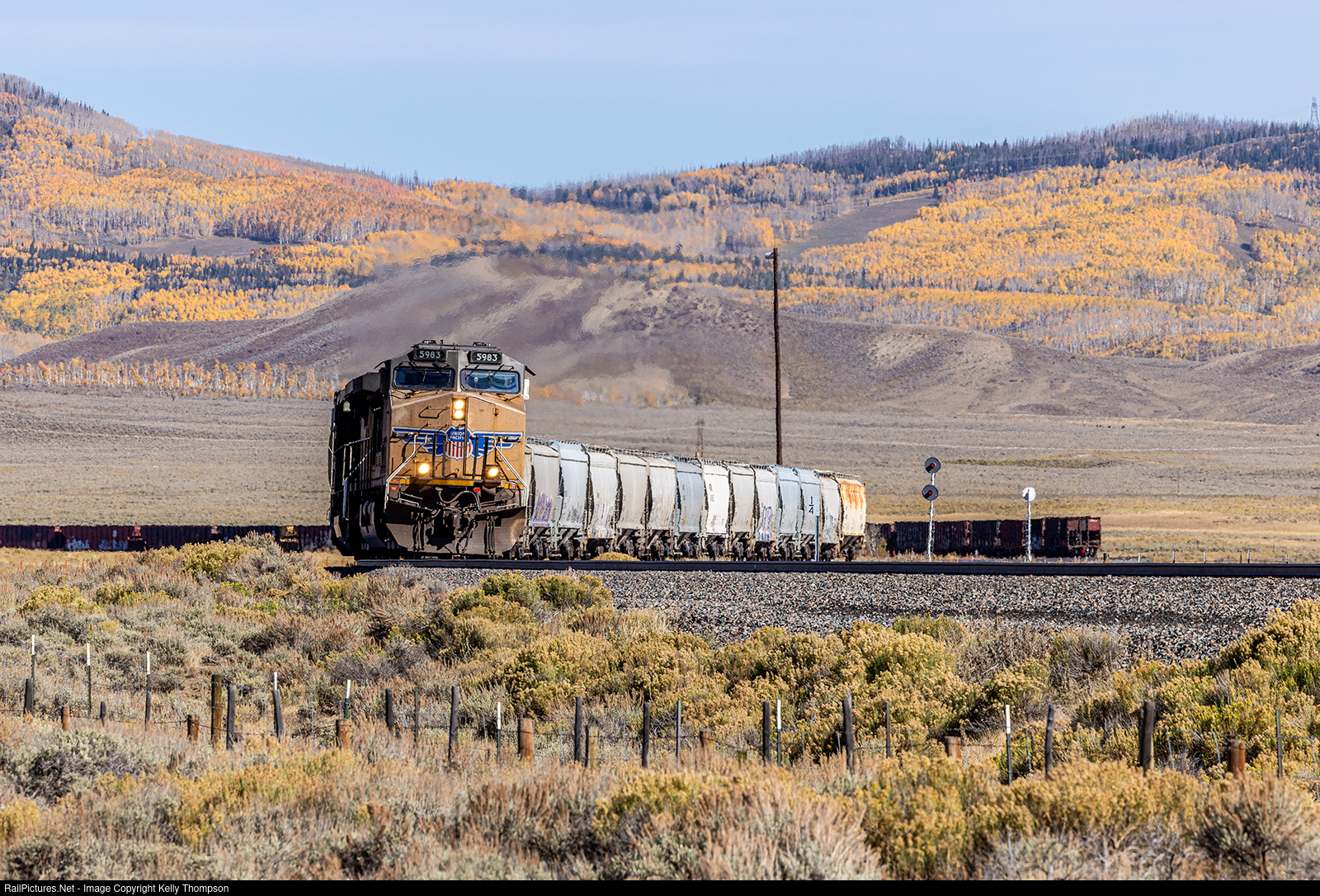 | The Bond local continues south as they pass some storage cars in the siding at Toponas. One of UP's old war wagons, UP 5983, leads the train south today. |