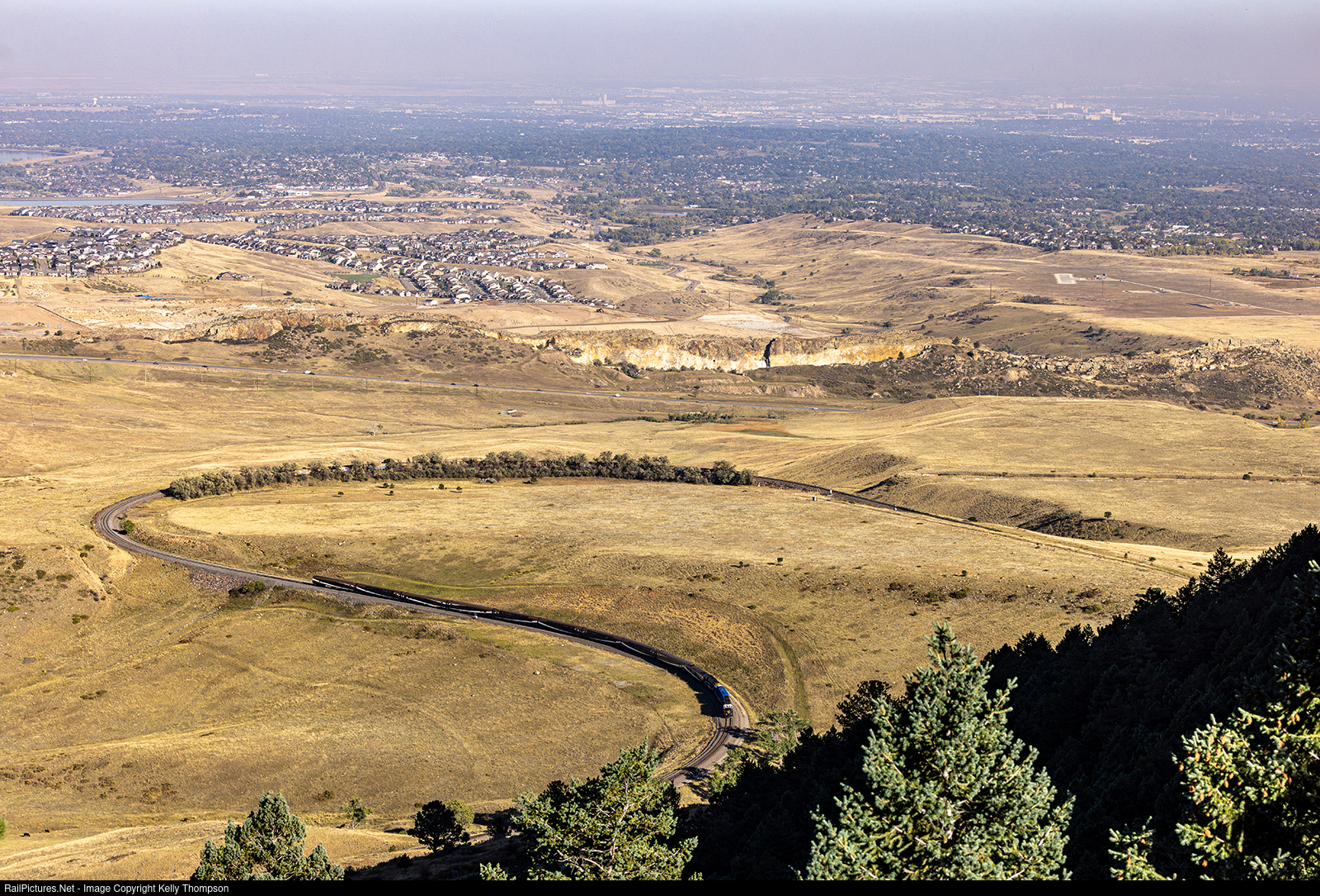 | The Rocky Mountaineer Rockies to Red Rocks train swings around iconic Big Ten curve as they make their way into Denver. Leading today's train is RMRX 8020, built for the B&O. |