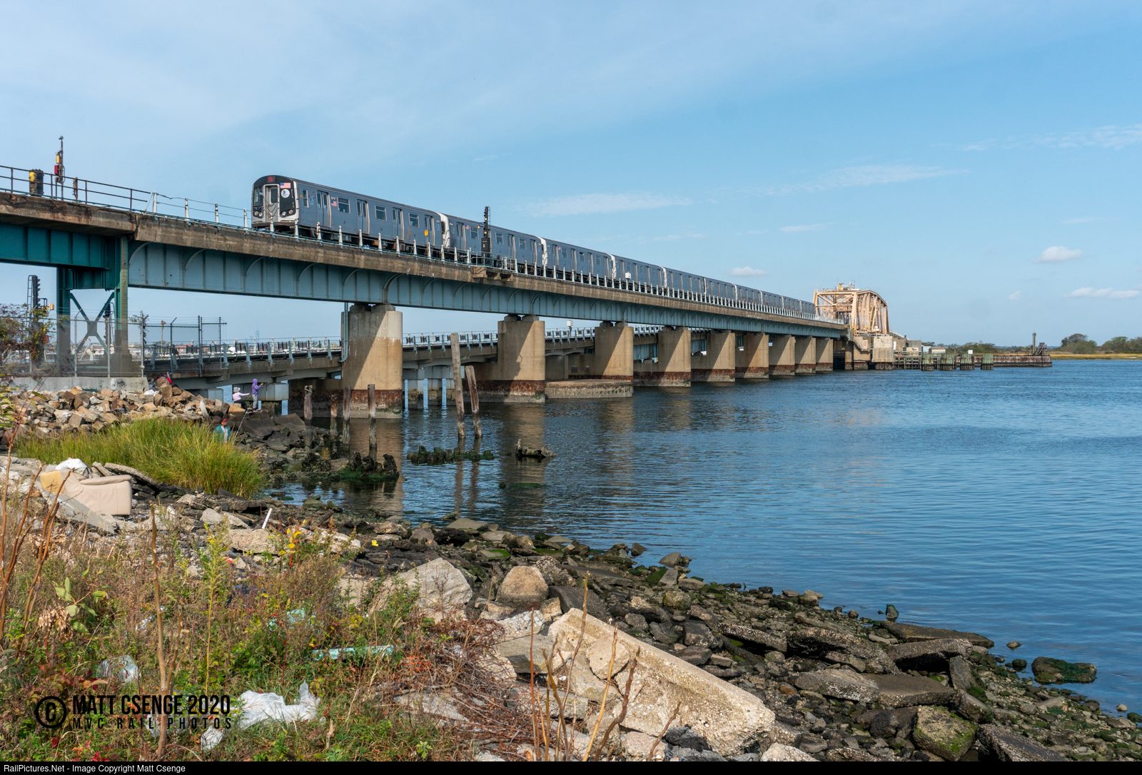 A Brooklyn-bound New York City Transit Authority (NYCTA) A train crosses the South Channel Bridge, one of two that bring the IND Rockaway Line "out to sea" to reach the Rockaway Peninsula in the borough of Queens. |
