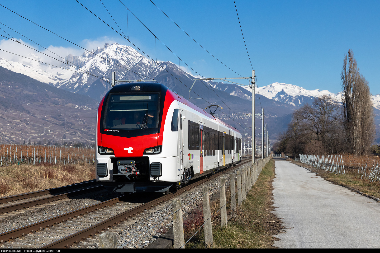 | Far from its future area of operation, a new Thurbo train, the Flirt Evo RABe 531 # 401, is on a test run at up to 176 km/h on the main line in Valais, between Ardon and Chamoson-St-Pierre-de-Clages. |