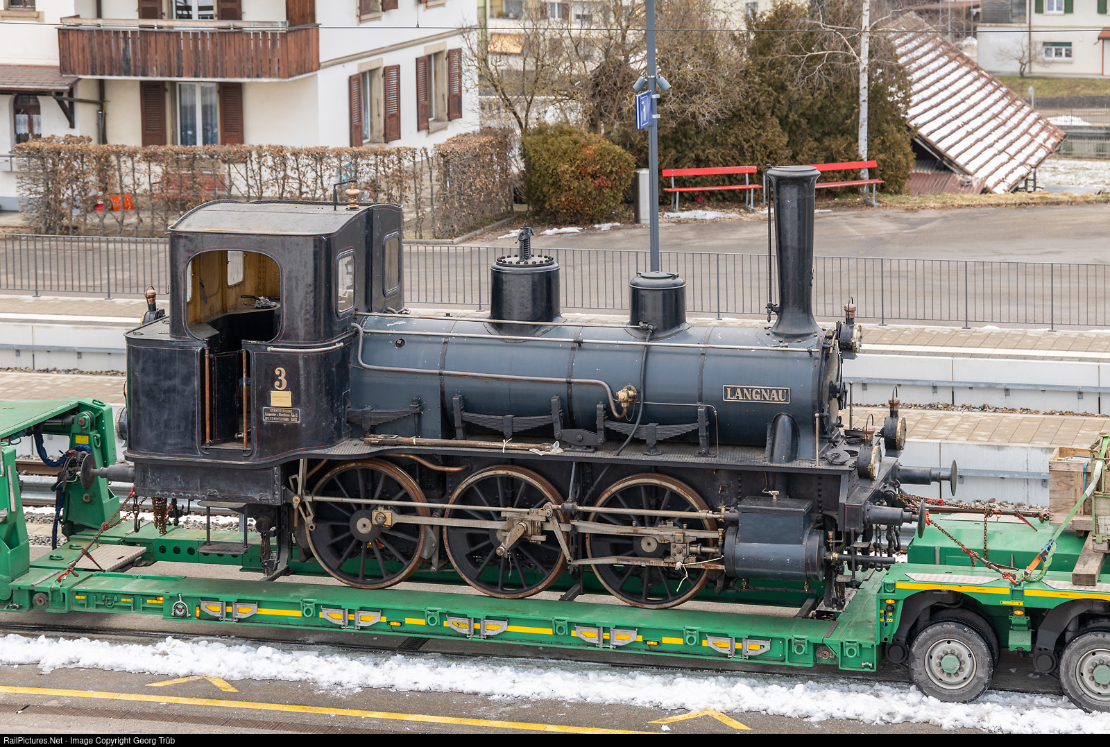 On this day, the 144-year-old steam locomotive Ed 3/3 # 3 “LANGNAU”, built in 1881 by SLM Winterthur for the Emmental Railway, was transported from the Swiss Museum of Transport's external storage facility in Rain to the Emmental and unloaded in Biglen. From there, it continued by rail to the workshop of the Bern Steam Railway in Konolfingen, where the locomotive will be restored to working order by May 2025. The locomotive comes from the Dr. Ernst Dübi Foundation of the Swiss Museum of Transport (VHS) and was handed over to DBB under a 5-year loan agreement. The 150th anniversary of the Emmental Railway will be celebrated on May 17/18, 2025. The goal is to have this locomotive operational again to this date.