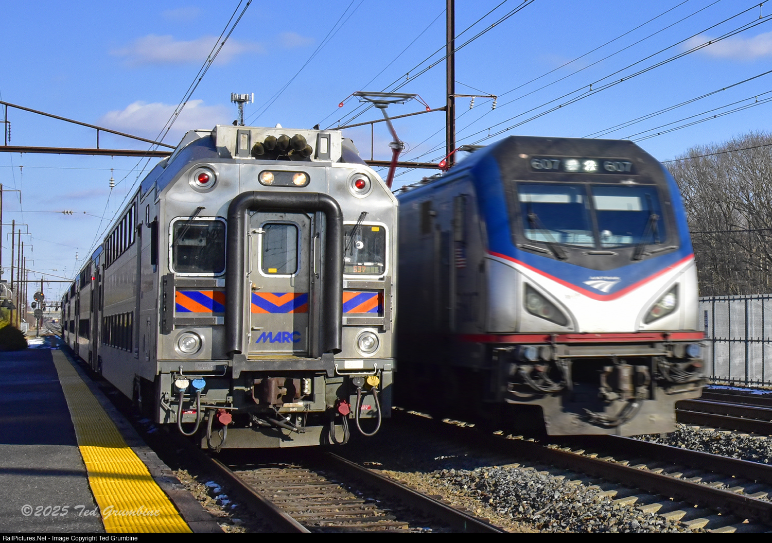 “Close Encounter” At 89 mph on Track 3, AMTK 607, with Amtrak 131 (NYP-WAS Northeast Regional) rockets past the standing MARC 537–waiting to depart on Track 4 at Perryville. MARC Train 537, with cab control car 8048 on point, will be pushed south by [MP36PH-3C MARC 31] promptly at the advertised 2:40 PM departure time.