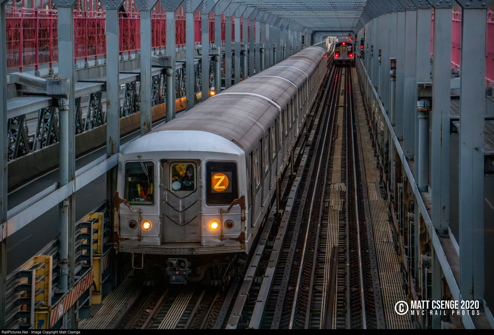 A New York City Transit Authority (NYCTA) Z train is seen crossing the Williamsburg Bridge from Brooklyn into Manhattan as it makes its way to Broad Street.