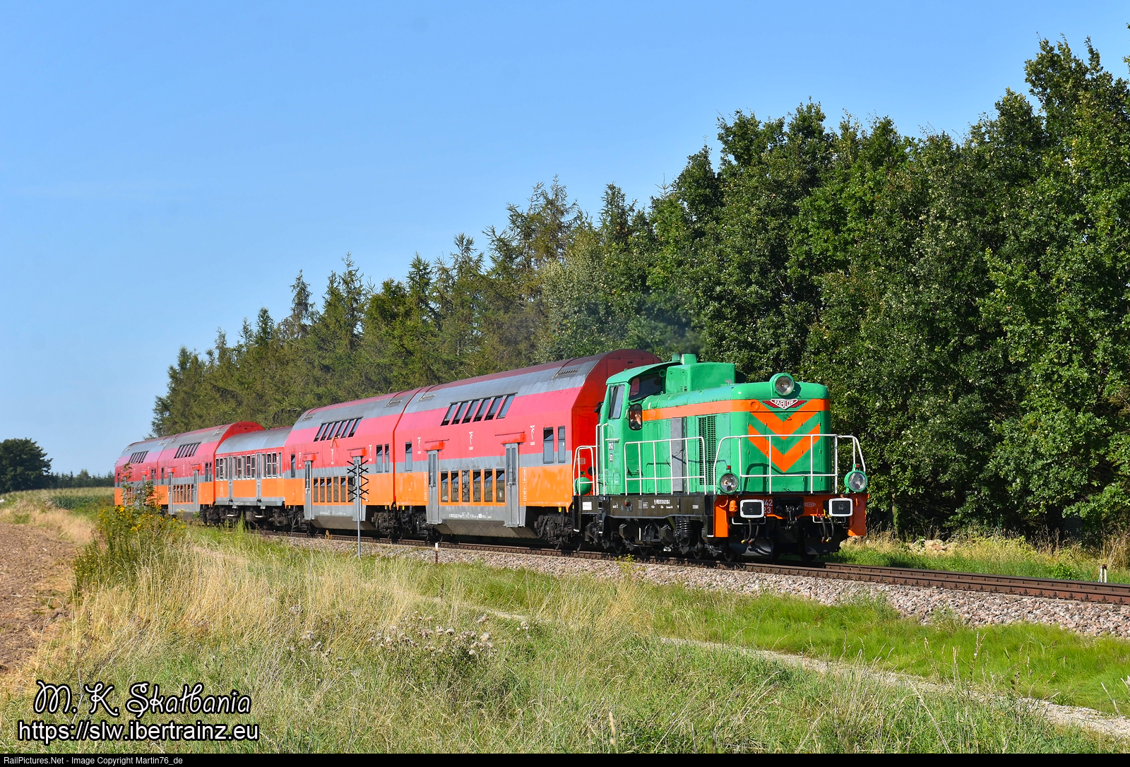The diesel locomotive SM42-523 hauling a passenger train from Hel to Chojnice.
