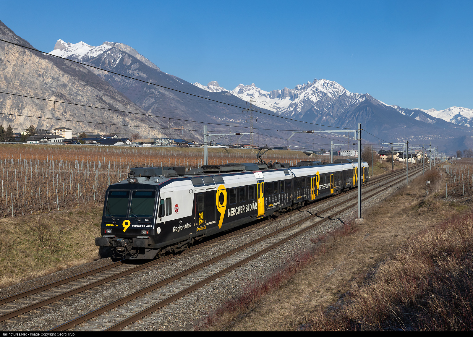 Domino push-pull train of RegionAlps, with railcar RBDe 560 # 414, is running the regional train 6217 of the line R91 from Monthey via St-Maurice-Martigny-Sion-Visp to Brig, between Riddes and Cahmoson-St-Pierre-de-Clages. The train has a publicity paint scheme for broadcast "Canal9 / PROCHE DE VOUS".