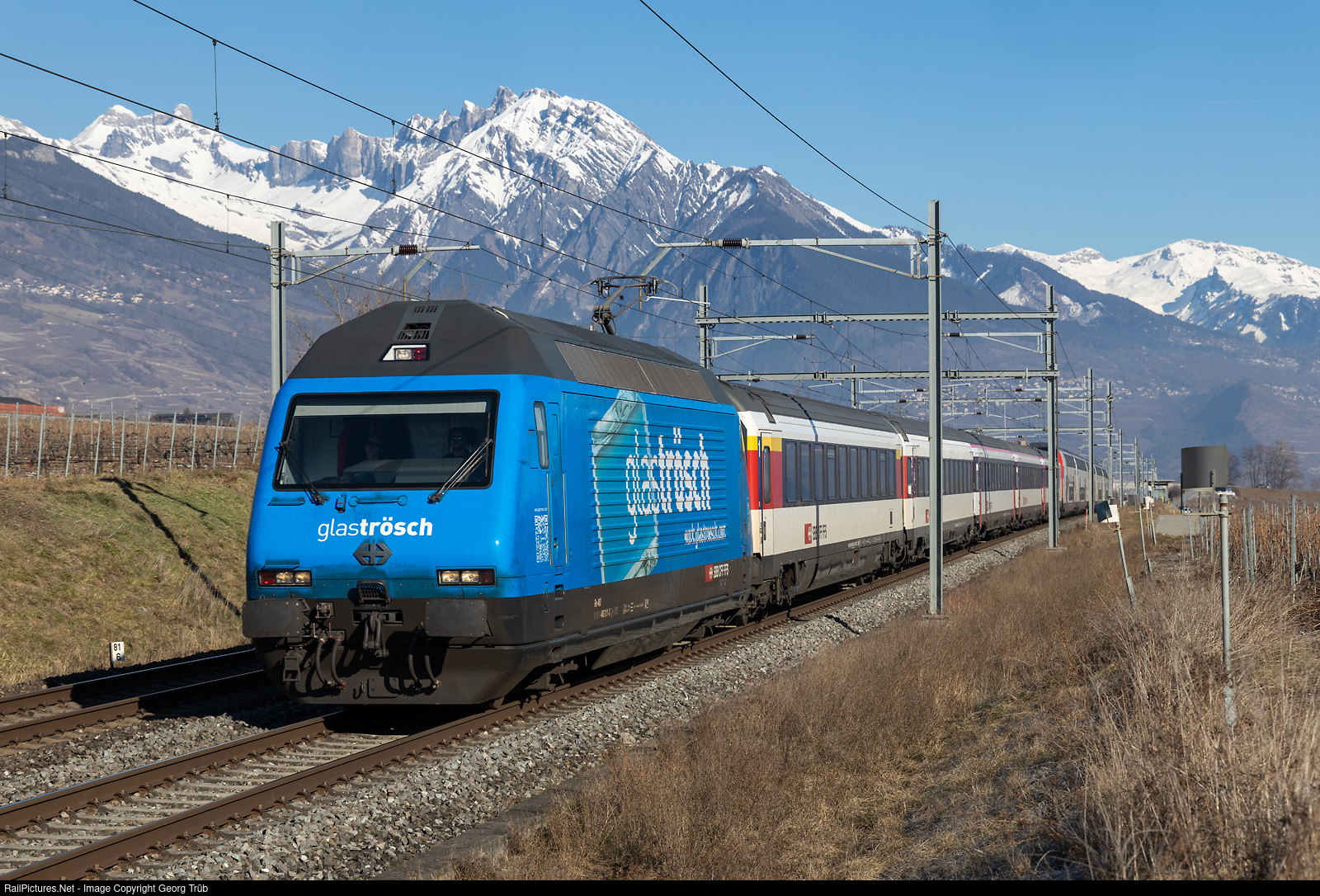 Re 460 # 011 of the SBB in the blue "Glas Trösch" publicity paint scheme pulls the IR 1820 from Brig to Geneva Airport between Chamoson-St-Pierre de-Clages and Riddes. In the rear of the train was another Re 460.