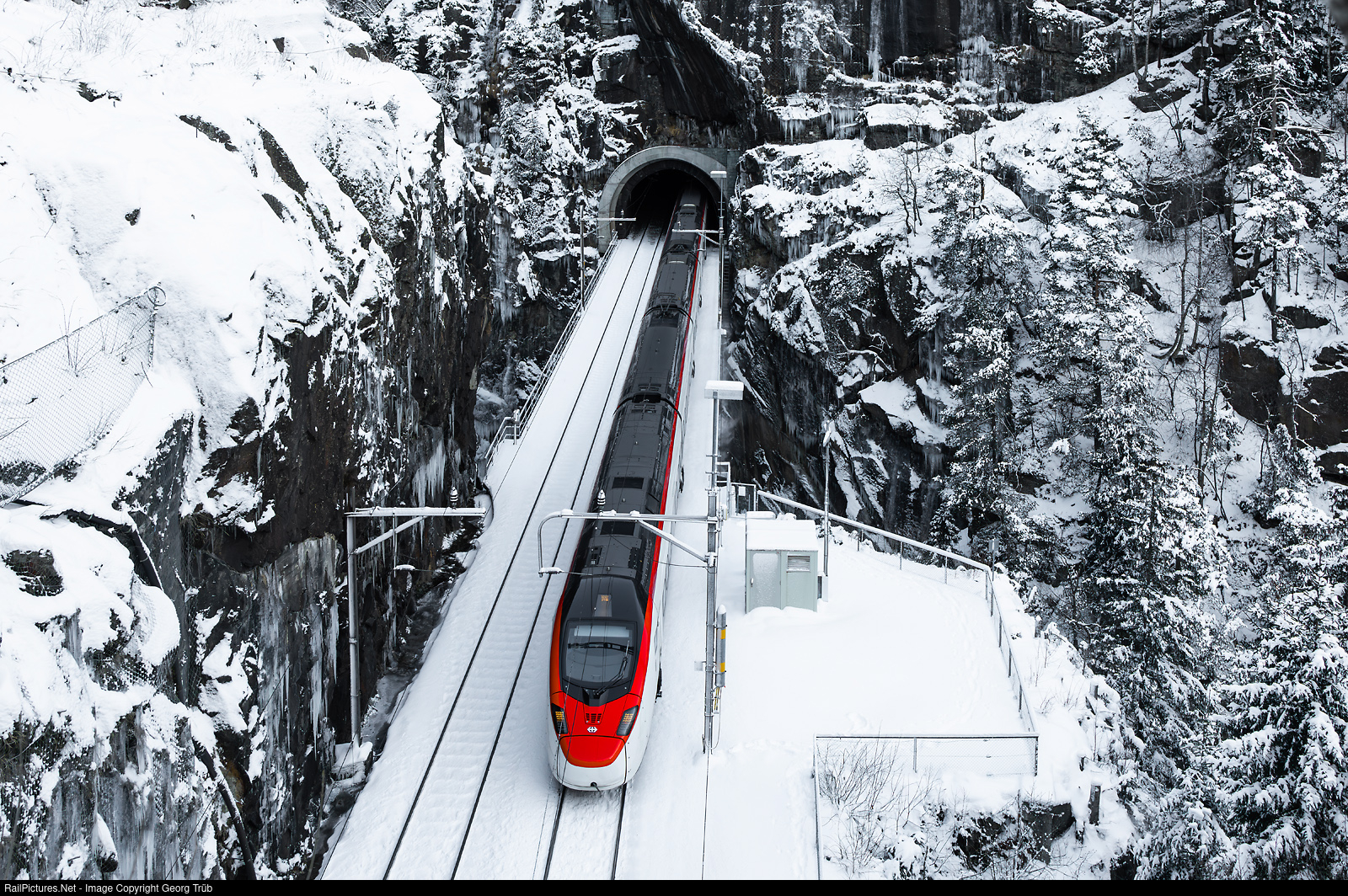 | Due to construction work in the Gotthard Base Tunnel, passenger trains will be rerouted via the Gotthard mountain route from January 13 to 25, 2025 and the base tunnel will be available for freight traffic without restriction. "Giruno" highspeed train RABe 501 of the SBB is leaving the Leggistein loop tunnel and crossing the Meienreuss gorge on the Gotthard north ramp between Wassen and Göschenen, running the IC 10663 from Basel via Olten-Lucerne-Arth Goldau-Bellinzona to Lugano. |