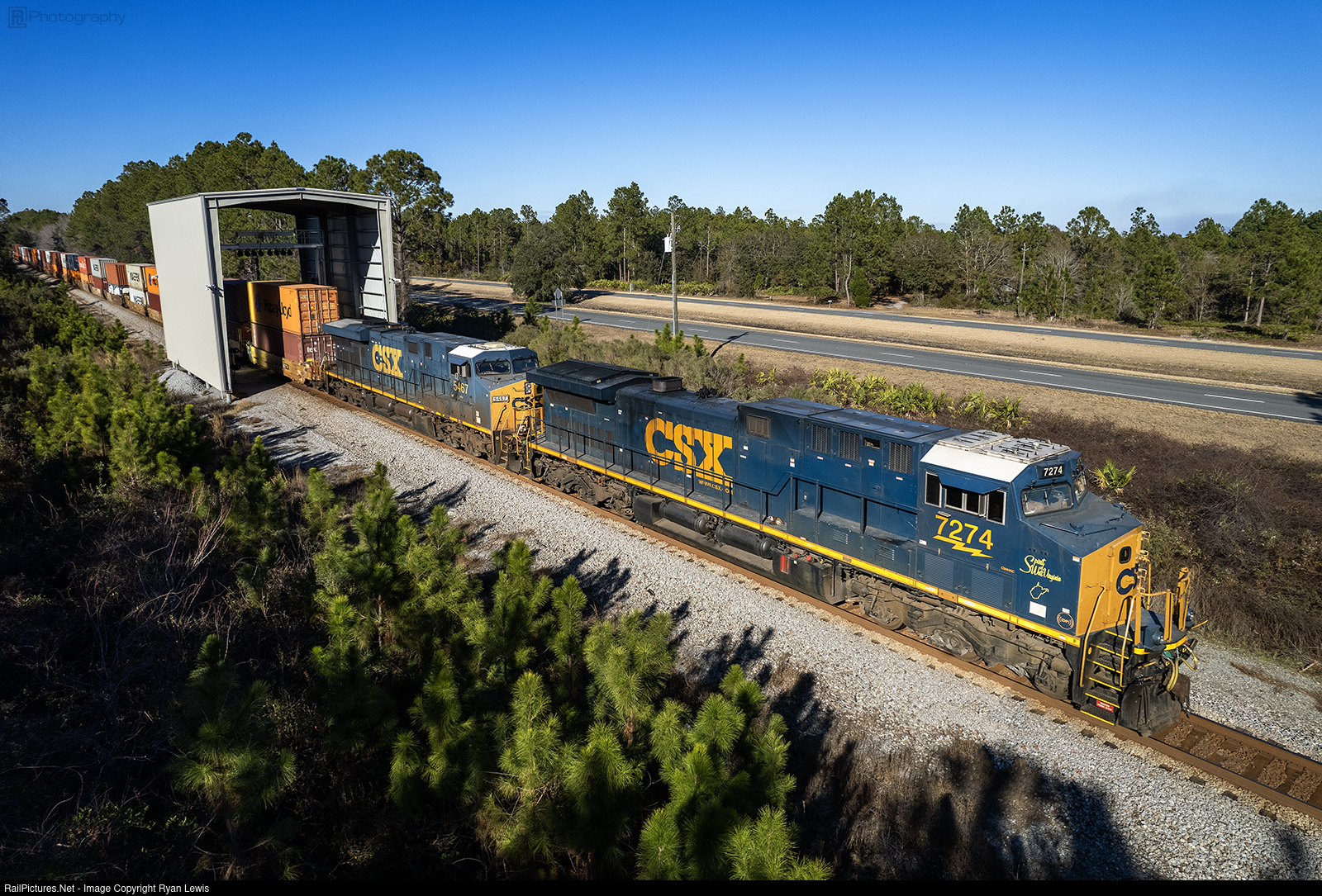 Built in 1994 as CSXT 9100, this was the first GE AC4400CW CSX received. By 1995, it was renumbered to CSXT 1. In 2001, CSX labeled it the Spirit of West Virginia. This engine was then renumbered again to CSXT 173 in 2021 due to renumbering the Business Fleet EMD F40s. In 2022, the engine was rebuilt and then numbered CSXT 7274. Two years later, CSXT 7274 is seen sporting Spirit of West Virginia again pulling I025-16 through the advanced inspection portal south of Waycross, GA.