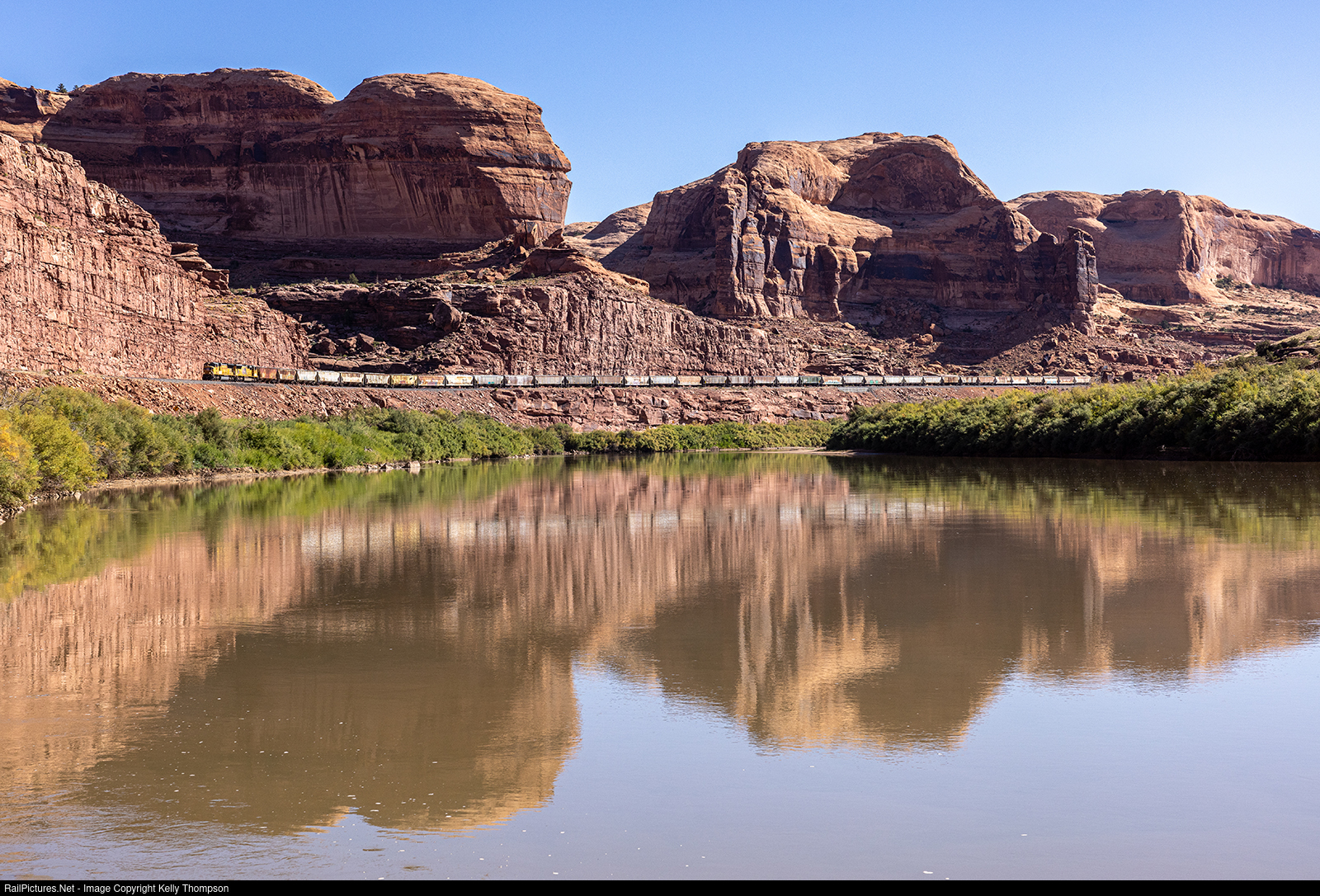 UP 4857 follows the Colorado River through Moab on their way to Intrepid Potash.