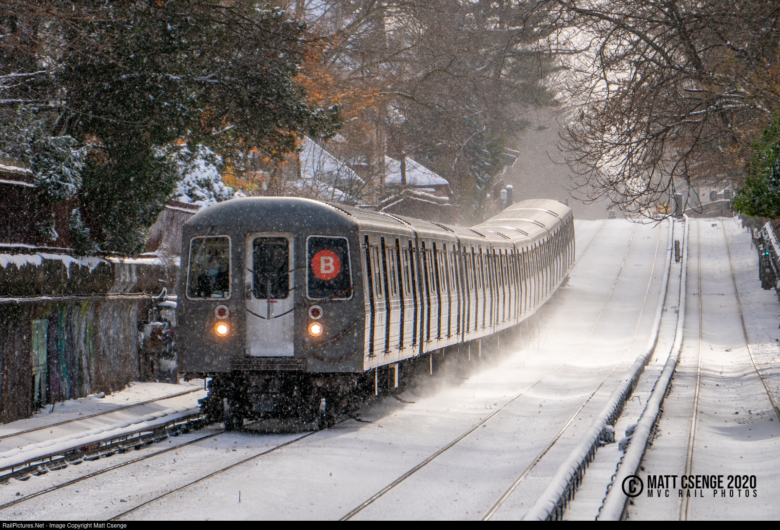 A Manhattan-bound New York City Transit Authority (NYCTA) B train races towards Newkirk Plaza Station on the BMT Brighton Line with a wake of powder from the freshly fallen snow.