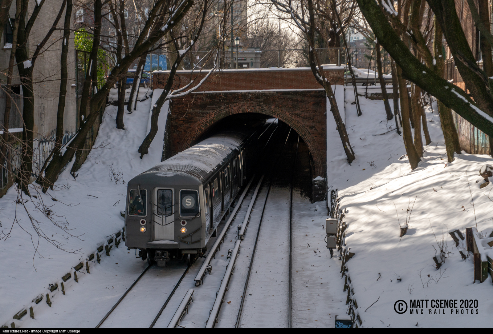 A northbound New York City Transit Authority (NYCTA) Franklin Avenue shuttle train emerges from the 1878 brick arch tunnel under Eastern Parkway.