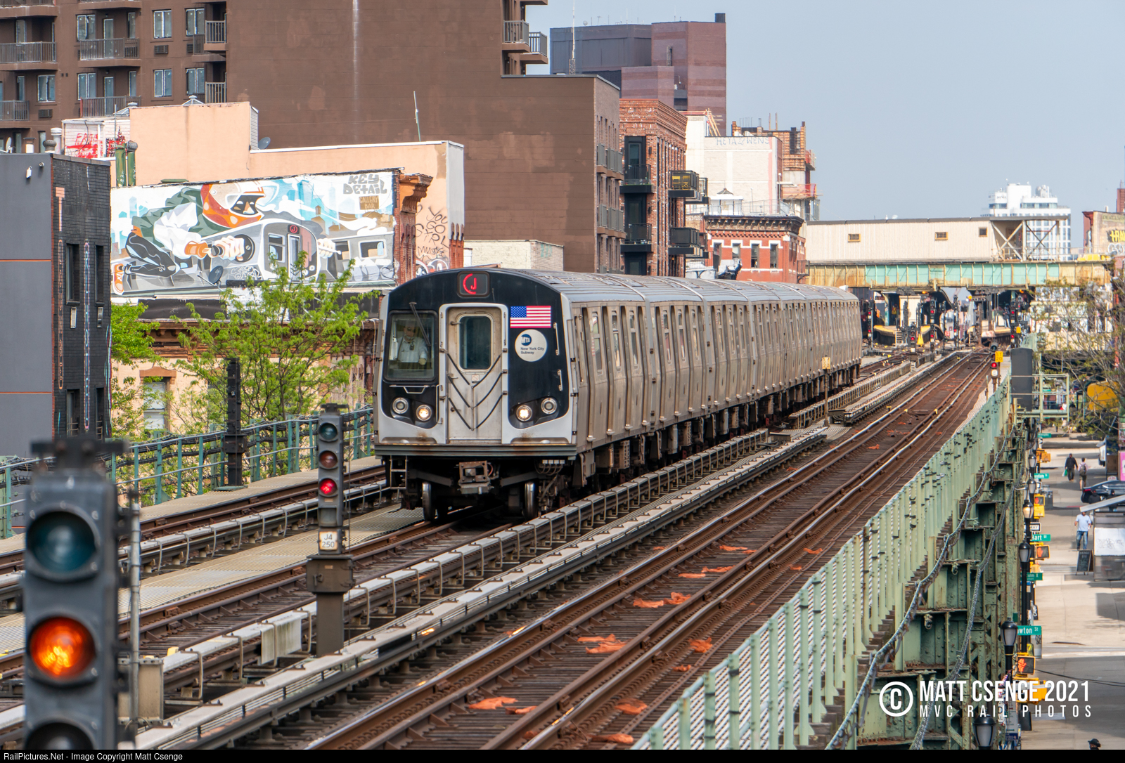 A Queens-bound New York City Transit Authority (NYCTA) J train is seen approaching Kosciuszko Street Station on the BMT Jamaica Line, passing a J train themed mural. (Though the rider in the mural seems to be doing it a bit differently!) |