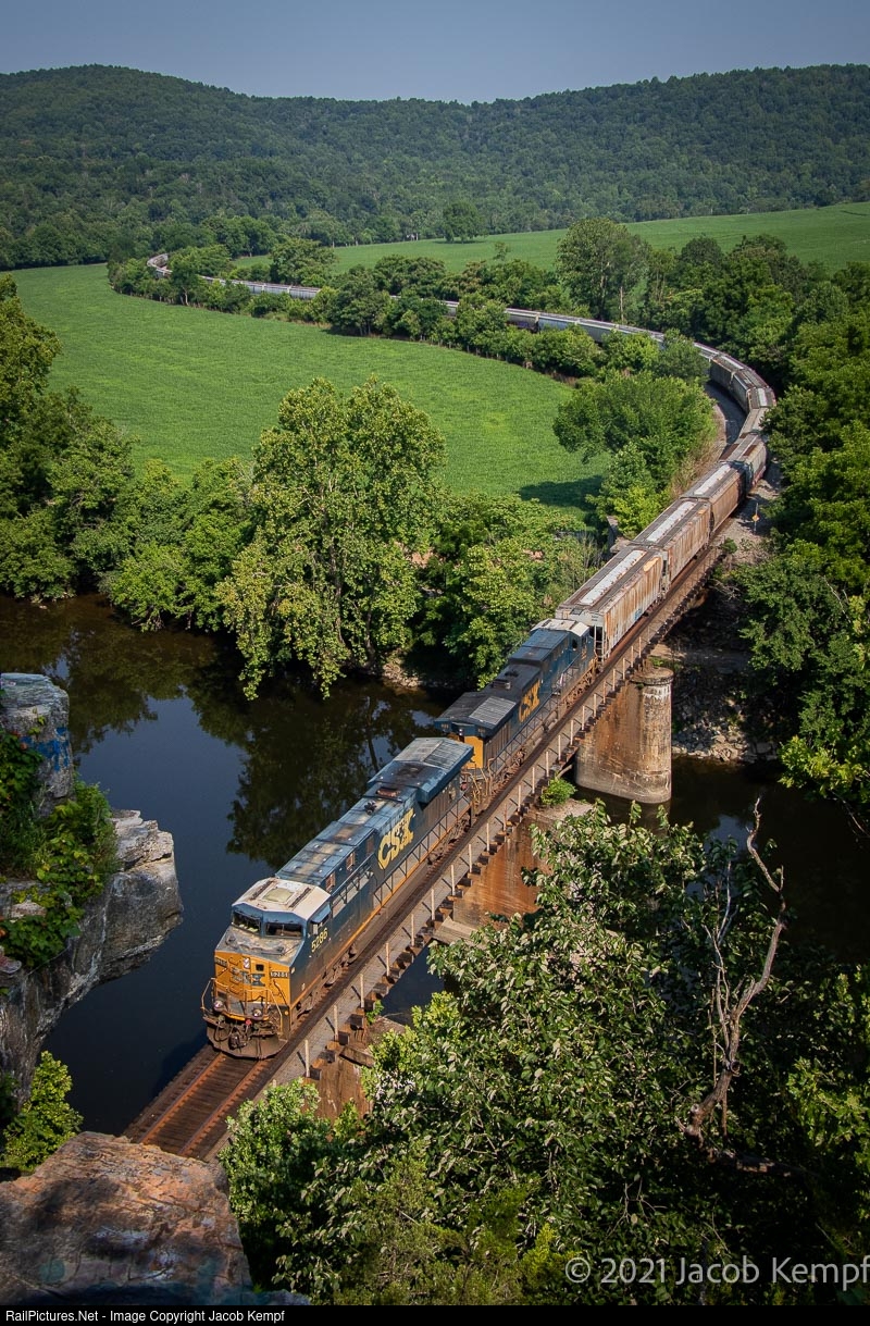 CSX grain loads head eastbound, passing over the James River, seen from the Button's Bluff overlook north of Springwood. If you are looking for a peaceful, quiet place to watch trains, this spot is for you! While traffic on this line is minimal, the scenery sure makes up for it!
