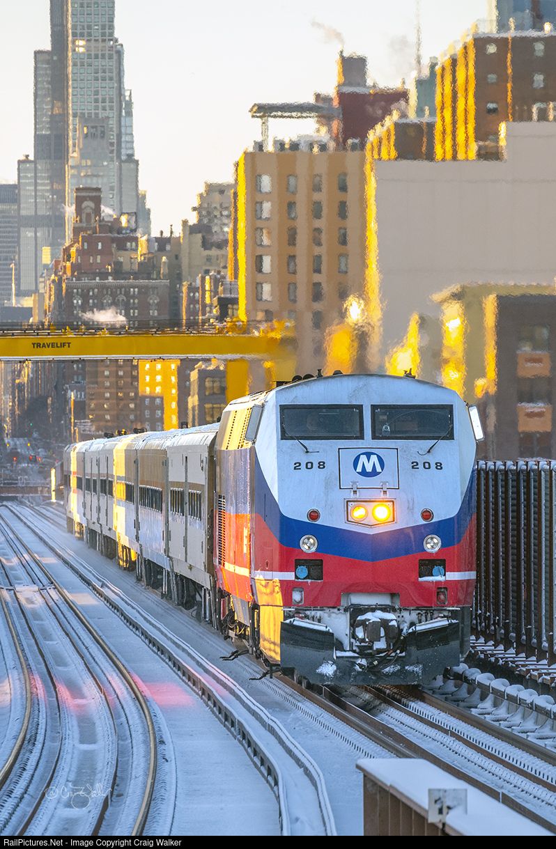 Not long after the sun rose over the eastern horizon, a seven-car Metro-North Railroad commuter train, with MNCW dual-mode* P32AC-DM 208 leading, wearing a retro version of the carrier's paint scheme, approaches the Harlem-125th Street station, its first stop since departing New York City's Grand Central Terminal about ten minutes earlier. This four-track mainline sees a near-constant parade of trains, even on a holiday such as this (January 20th is Martin Luther King Junior Day). MNCW Hudson Line train 8807 is heading for Poughkeepsie NY. (New York, New York – January 20, 2025)