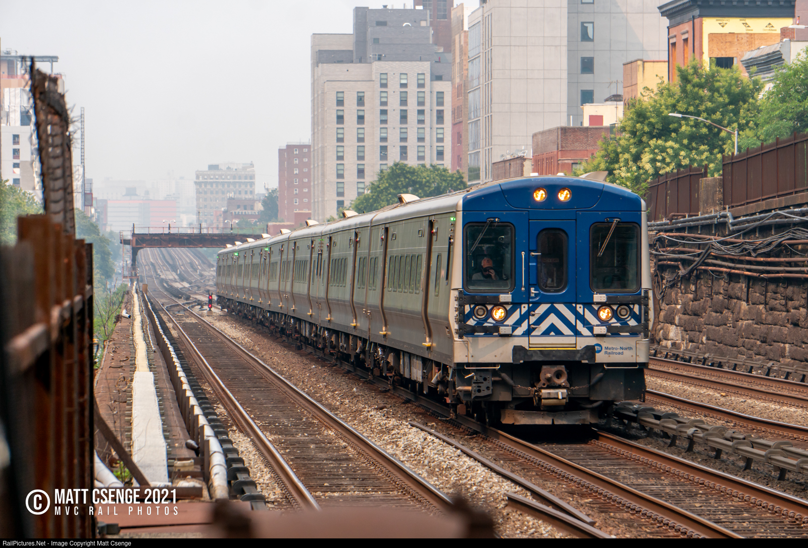 On a hazy day where the air is thick with wildfire smoke, an inbound Metro-North Railroad Harlem Line train is seen approaching the portal of the Park Avenue Tunnel. If you look close, you'll see the engineer is in the process of removing their sunglasses in preparation for the descent into darkness.