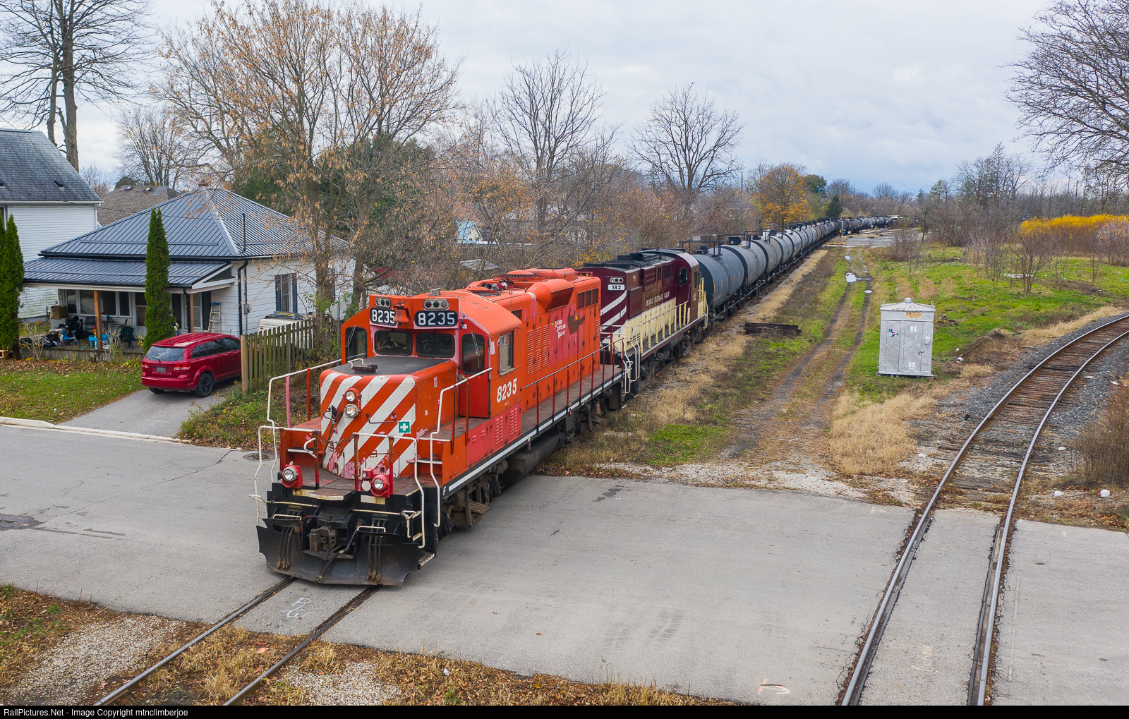 | After utilizing the wye to drop their inbound cars on the bridge west of the yard in St. Thomas, Ontario, the Ontario Southland crew used the wye again to run around due to the yard being full with cars dropped earlier in the day by GIO Rail. Now on the east end of the yard, GP9U 8235 is in the lead as the crew puts their train together to head back towards Ingersoll.