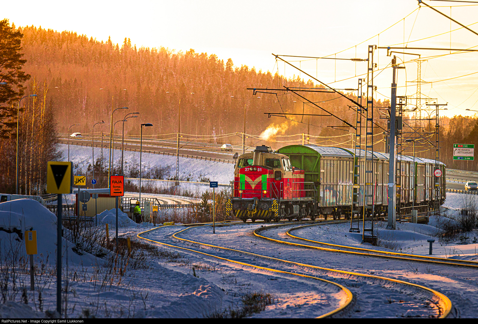 It's a sunny Sunday, but don't let the view to disstrack you as the weather is very cold and everything is freezing. While the sun is setting behind the high hills of Kuopio, the usual industrial switcher arrives at Sorsasalo as the class Dv12 diesel hydraulic locomotive number 2751 acts as today's workhorse. Some preparations need to be done, before the train can continue towards the factory. Soon the nearby level crossing starts to ring and the train can dissappear in the neighbouring forrest.