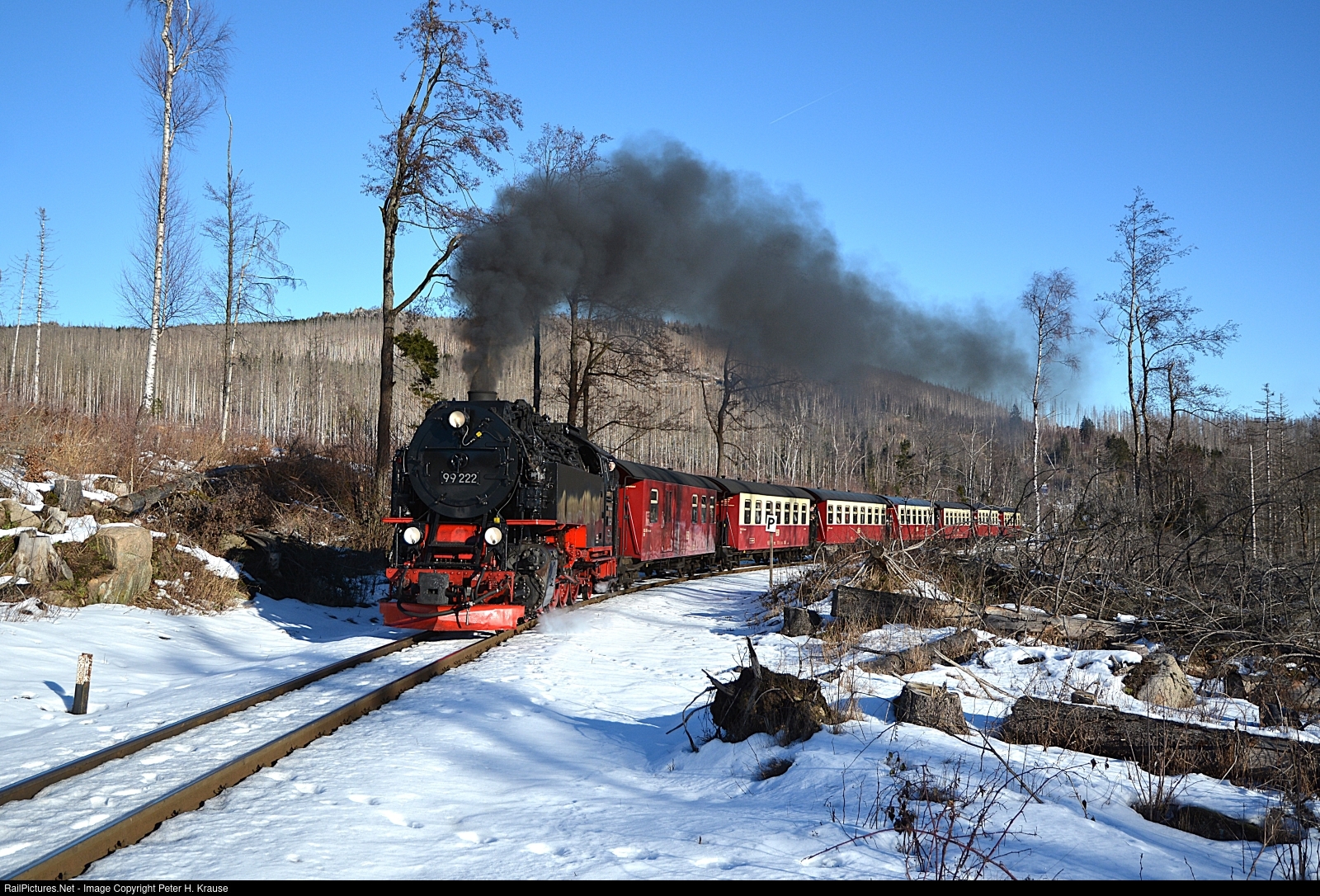 | 99 222 is heading the 2nd passenger train to the Brocken on this beautiful winter day. The train has just passed the level crossing east of Schierke. The footprints in the snow beside the tack are from a lynx who might have been here the night before. |
