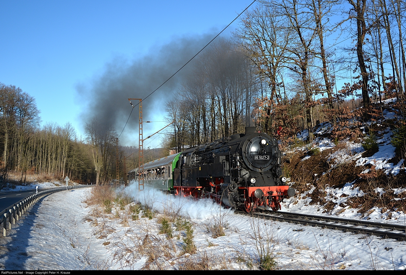 | On this sunny Sunday 95 1027, built in 1923 as a T20 of the former Royal Prussian Railroad, ran the 2nd excursion train of the 2025 season. On the steepest grade of the Rübelandbahn, the train has almost reached the summit of the track north of Hüttenrode. |
