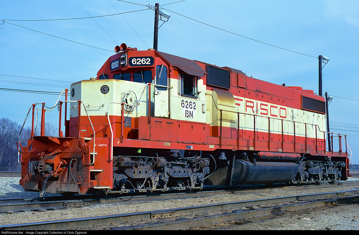 Frisco had four SD38-2 locomotives, two with dynamic brakes and two without. In 1980 the BN took over and a paint out and renumbering occurred. Here it is in its short livery, but I think the Frisco paint looks so much better than the soon to be received BN paint.