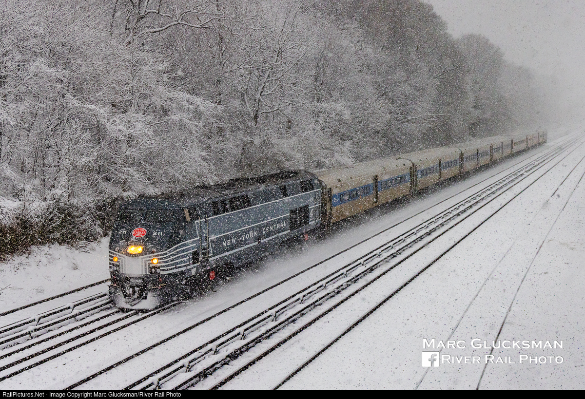 Through The Forests Of The Bronx. The snow was still falling at a good clip on the morning of February 13, 2024 when MTA Metro-North Railroad Train 8807 approached the Riverdale Station in the Bronx, New York with MNCW 211 (P32AC-DM, New York Central Tribute) leading. In contrast with the tall buildings and concrete that one might perceive cover the whole five boroughs, this area of New York City is has extensive park land, which in this case makes it almost look like someplace far from population, with only the underrunning third rail as a geographic identifier.