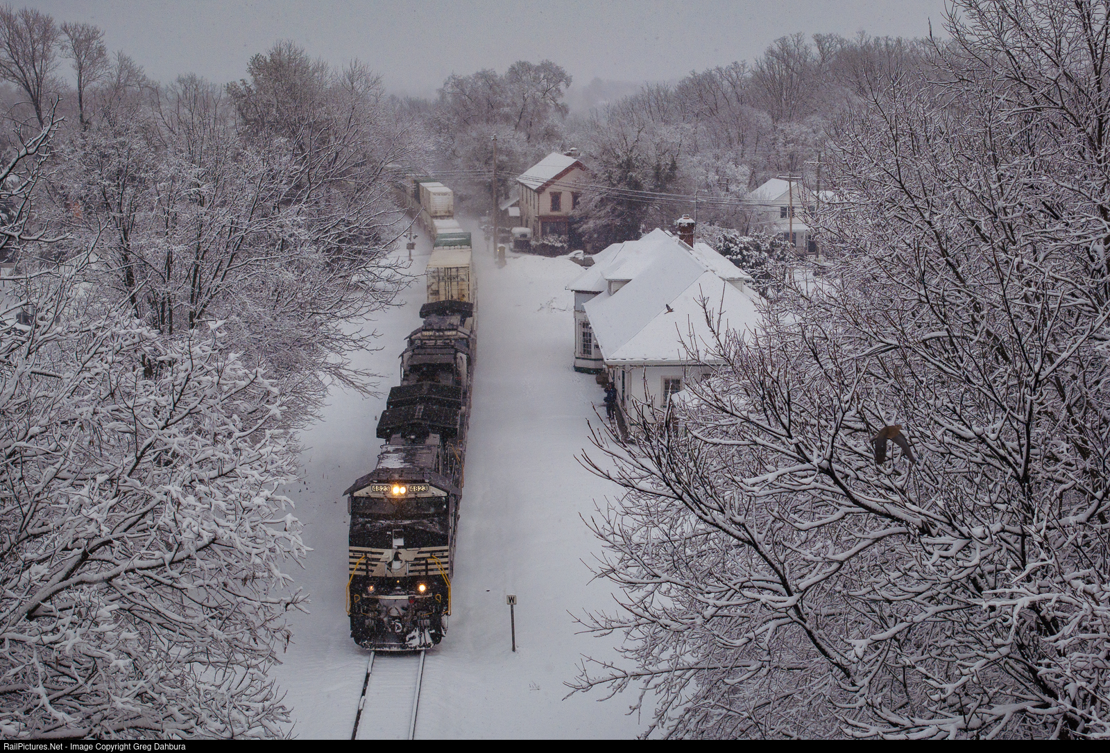 | NS 27A blasts through Boyce and the former N&W depot as snow is falling. A bird shots through the frame to the right, startled by the passing train. |