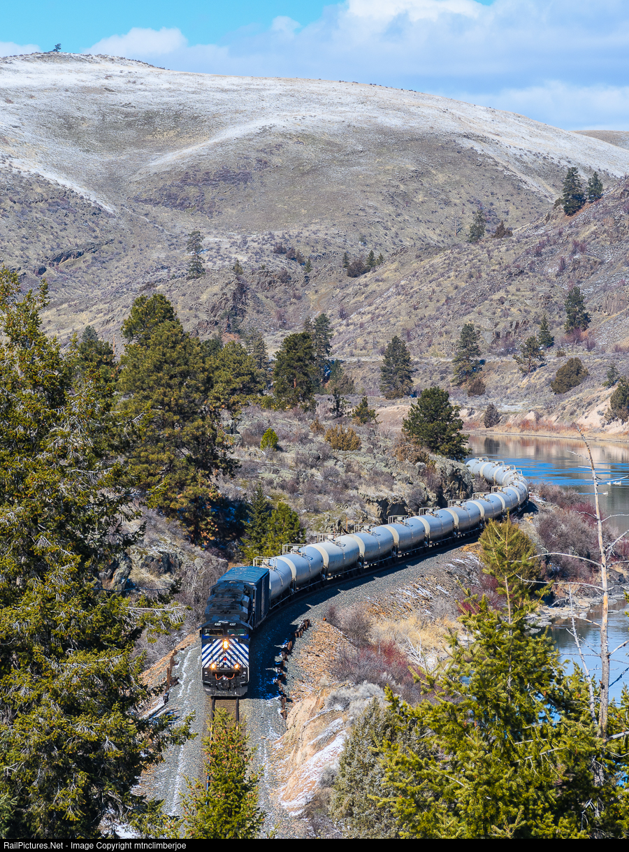 | A pair of SD70ACe's lead the Montana Rail Link's Day Gas job as it makes the eastbound return trip with empty tank cars from Thompson Falls to Missoula. The train is following the Flathead River on the 10th Subdivision, rounding a bend along the riverbanks outside of Perma, Montana. |