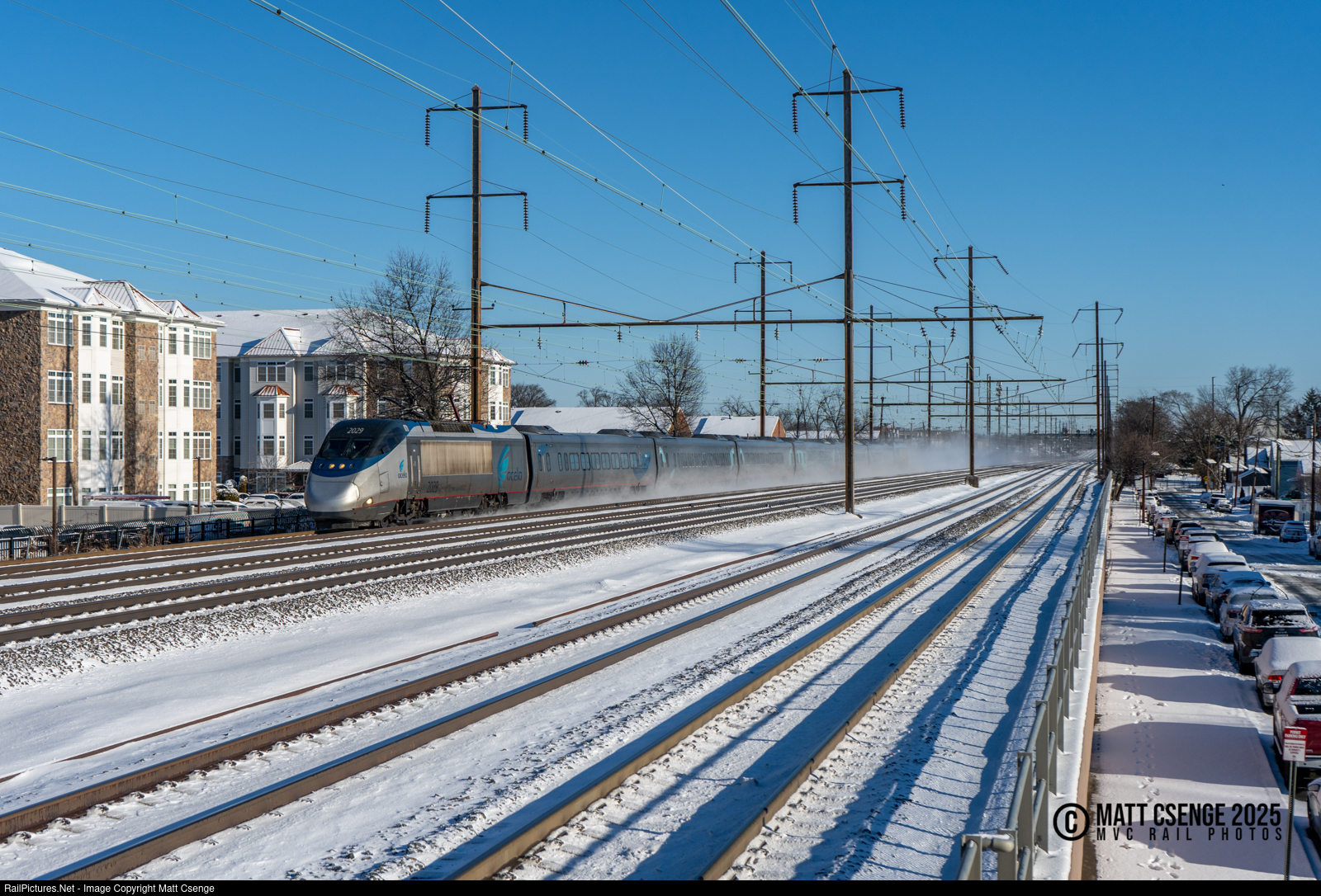 Amtrak Acela power car 2029 is the lead unit on westbound train 2151, seen racing through Linden, NJ on a frigid morning. |