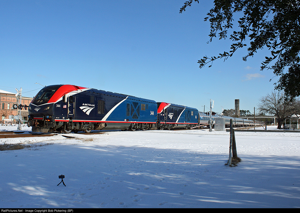 | Southern Snow! Amtrak 97 works the station in snowy Jesup. I-95 and airports had closed, Amtrak though late kept running. |