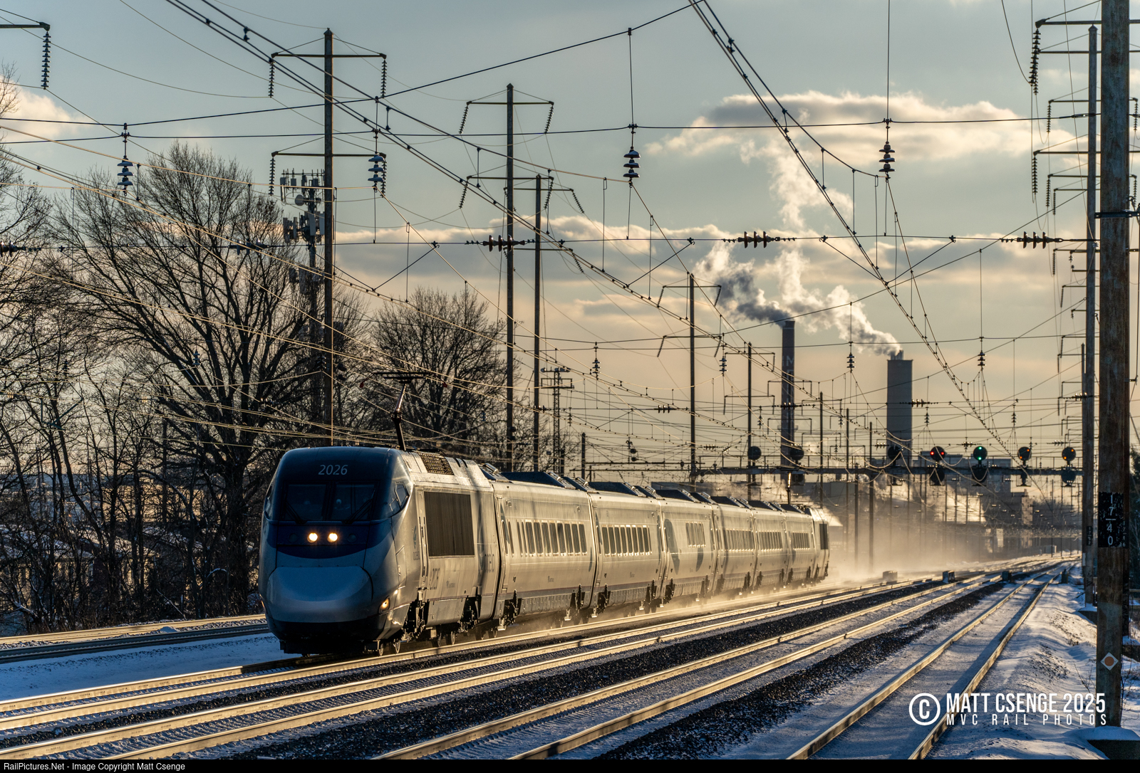 Amtrak Acela Express train 2168 is seen approaching Linden Station as the sun sinks low in the sky and casts a golden glow over everything it touches. The sleek high-speed trainset is juxtaposed against the industrial scene in the background, illustrating the two priorities of American railroading: passengers and industry - priorities that are often quite strongly opposed to each other! |