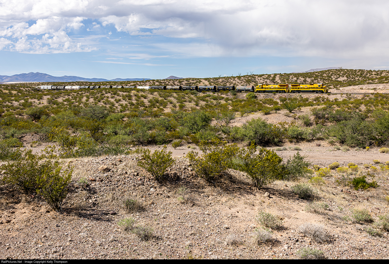 AZER 4010 pulls its train along the desert landscape as they prepare to stop in the siding and finish up for the day.