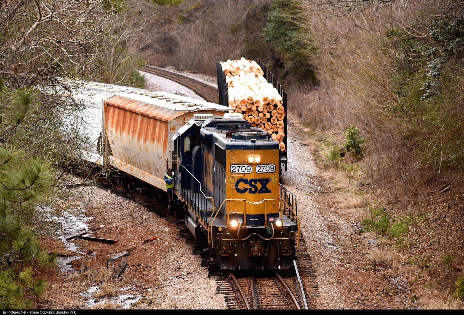 On the move southward out of town, the local stops and unhooks from three loaded pole cars near the switch at Mohawk Industries. The conductor holds on, as the engineer brings the Geep back to the mainline after picking up 4 cars from Mohawk. They will couple back up to the cars of wood poles, and travel several miles before entering LaGrange, Ga.