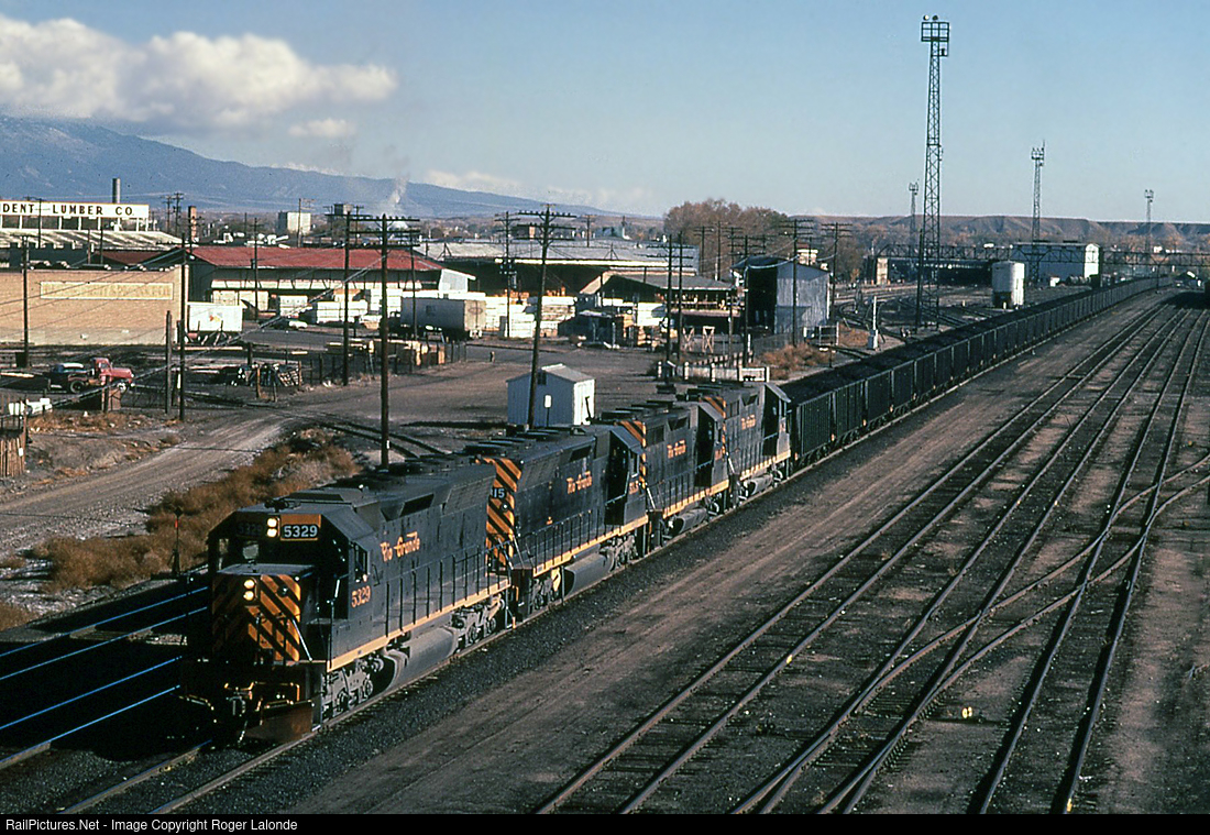 Rio Grande SD45 5329 and first of the SD45s, the 5315 was delivered in January 1967, leads a pair of Geeps on a westbound coal train at Grand Junction, Colorado on January 1, 1969. Photo by F.H.Wagner, from my collection.